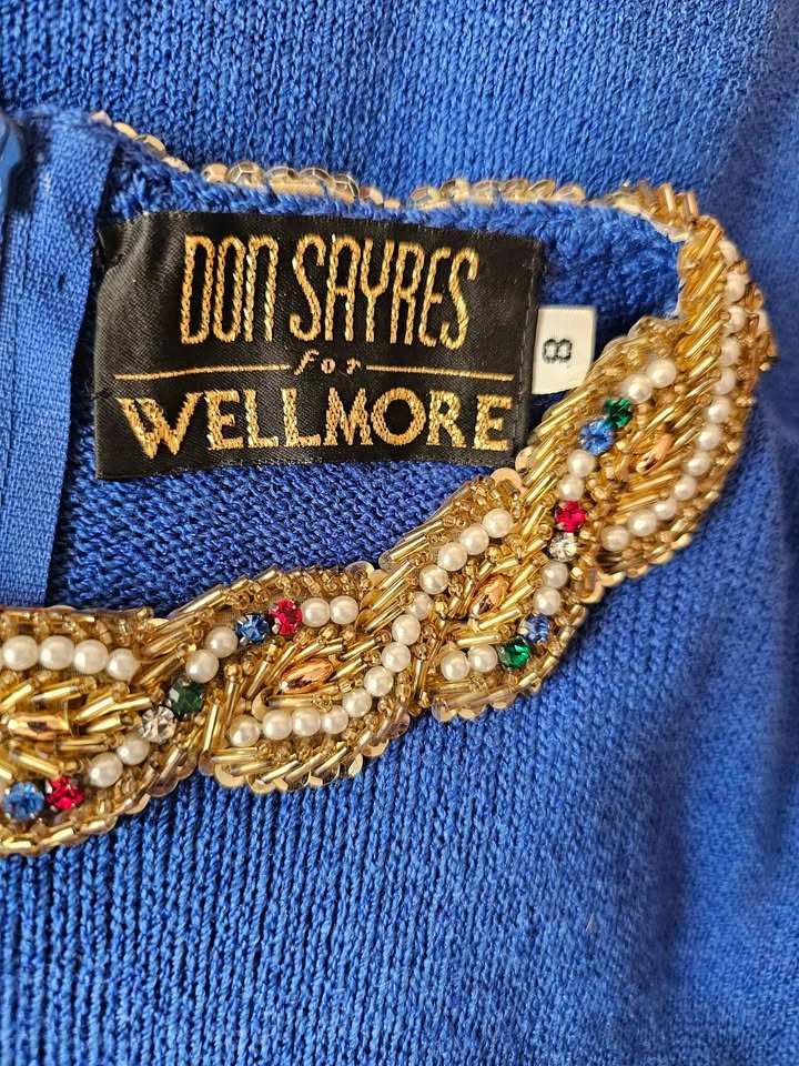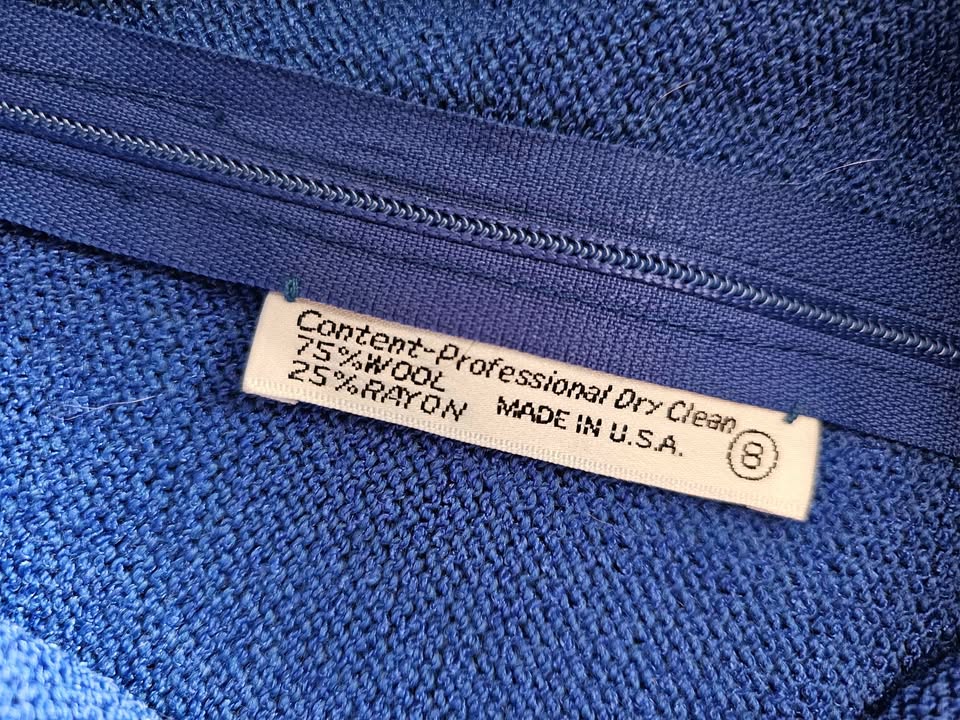 Dress is a lovely and vivid shade of royal blue and the length comes to above the knee. It has a round neckline and a hidden rear zipper closure. Made of a stretchy knit that is 75% wool, 25% rayon, by Don Sayres for Wellmore.