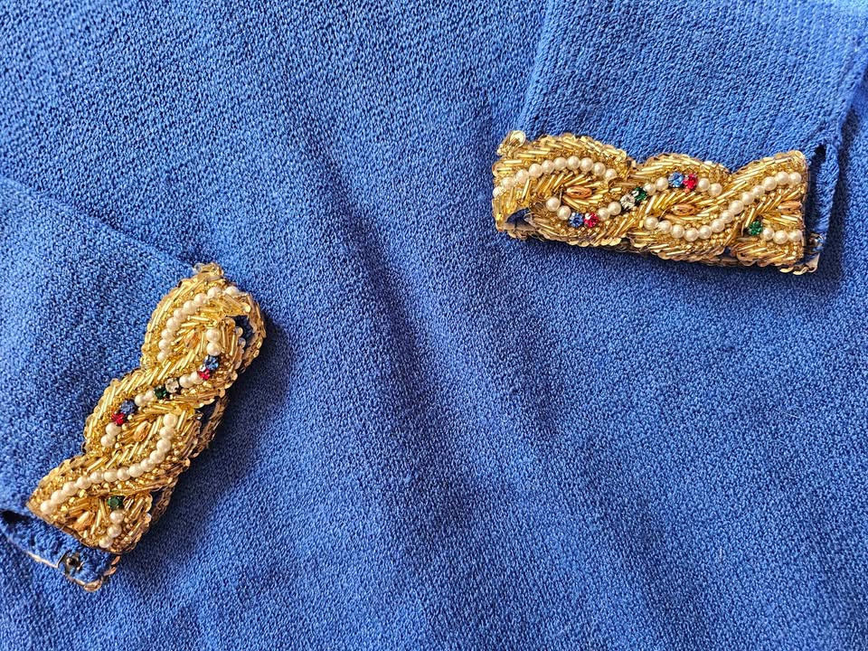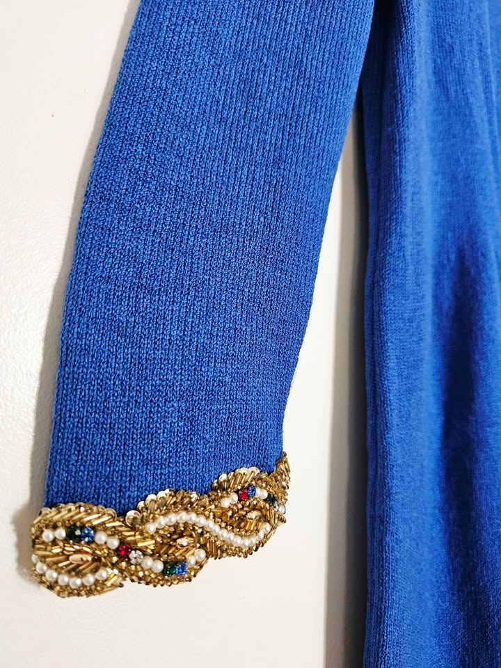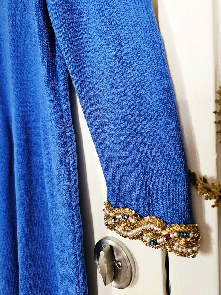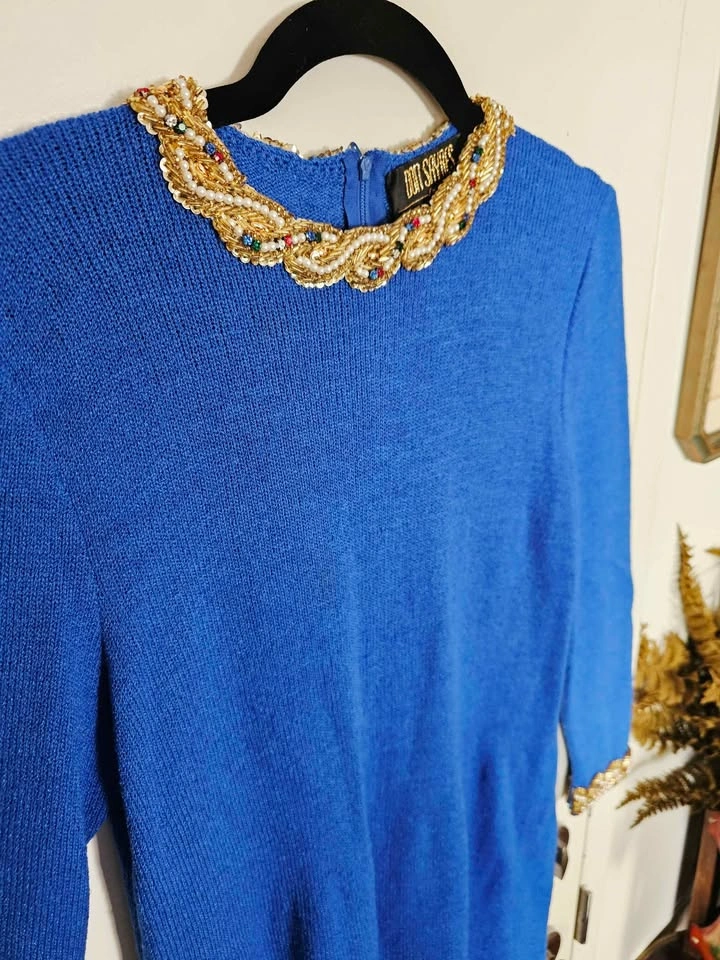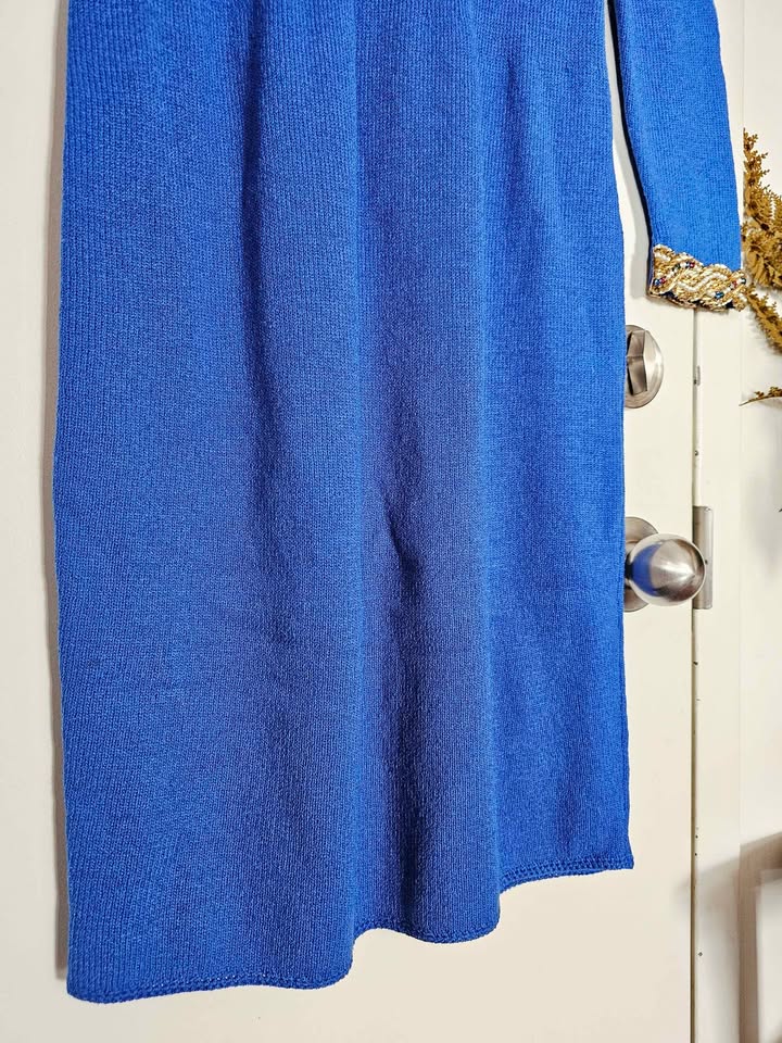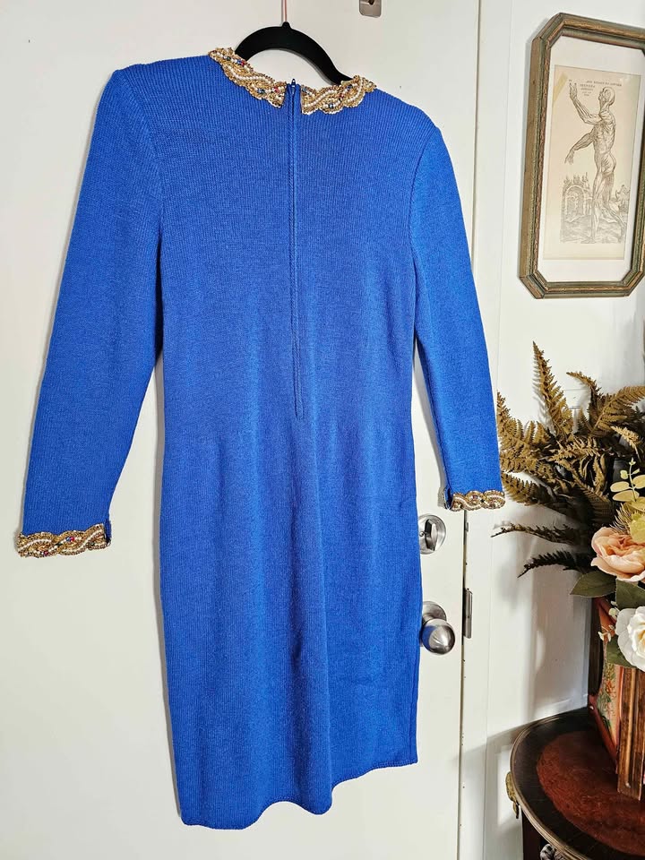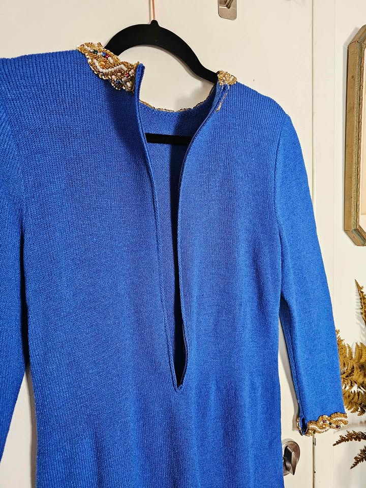 80s Wool Beaded Retro Glam Knit Blue Dress Vintage Party Dress