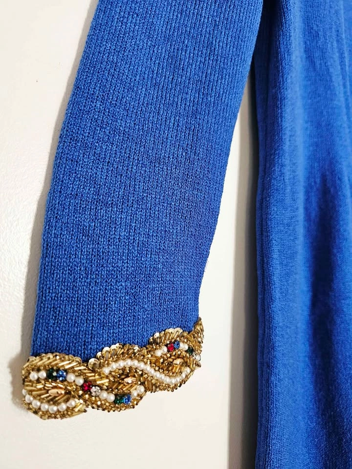 Beautiful vintage 1980s wool blend warm long sleeve knit pencil dress with glam sparkly 3D beading around the collar and cuffs! Beaded sections contain gold beads and sequins, faux pearls, and green, blue, red and clear rhinestones in a twisted design.