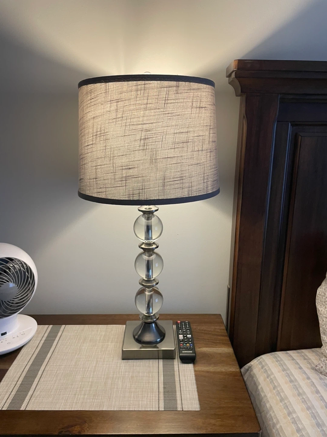 Selling a lovely table lamp! It has a stylish design with glass balls and a neutral-toned shade. It would look great on a bedside table or in a living room