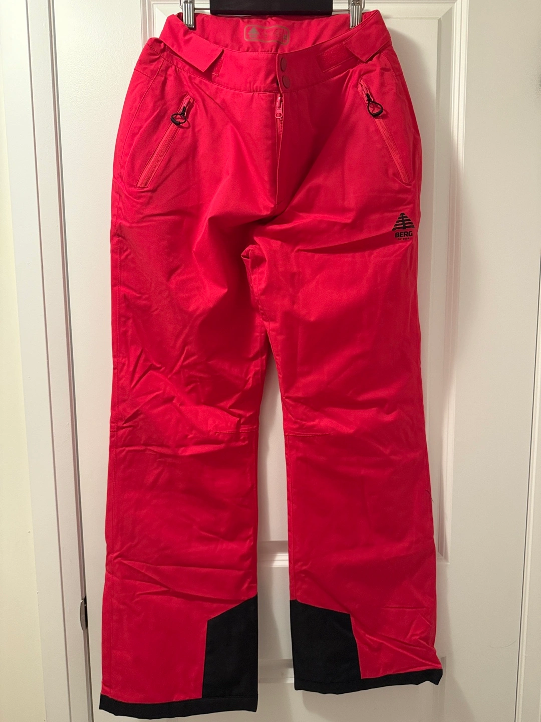 Selling a pair of red Berg snow pants in size medium! These pants feature a stylish red colour with black accents at the bottom. Perfect for keeping you warm and dry during your winter adventures! Cash only.
