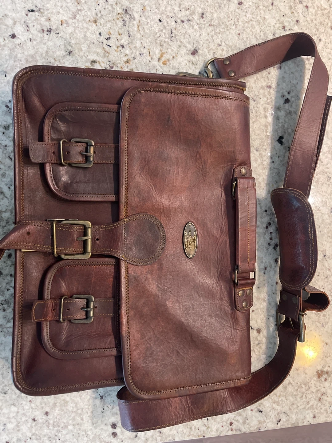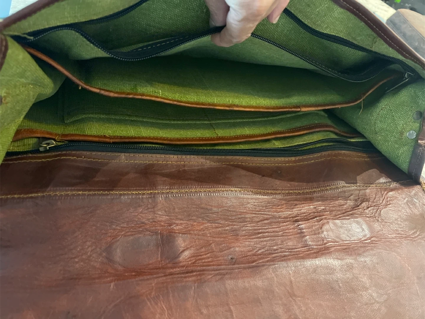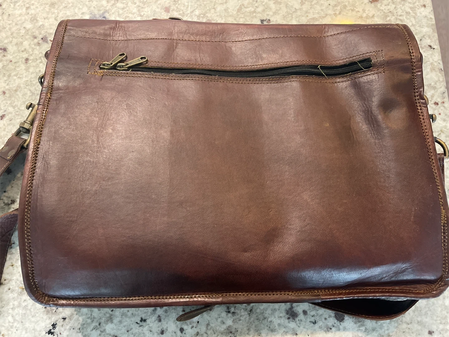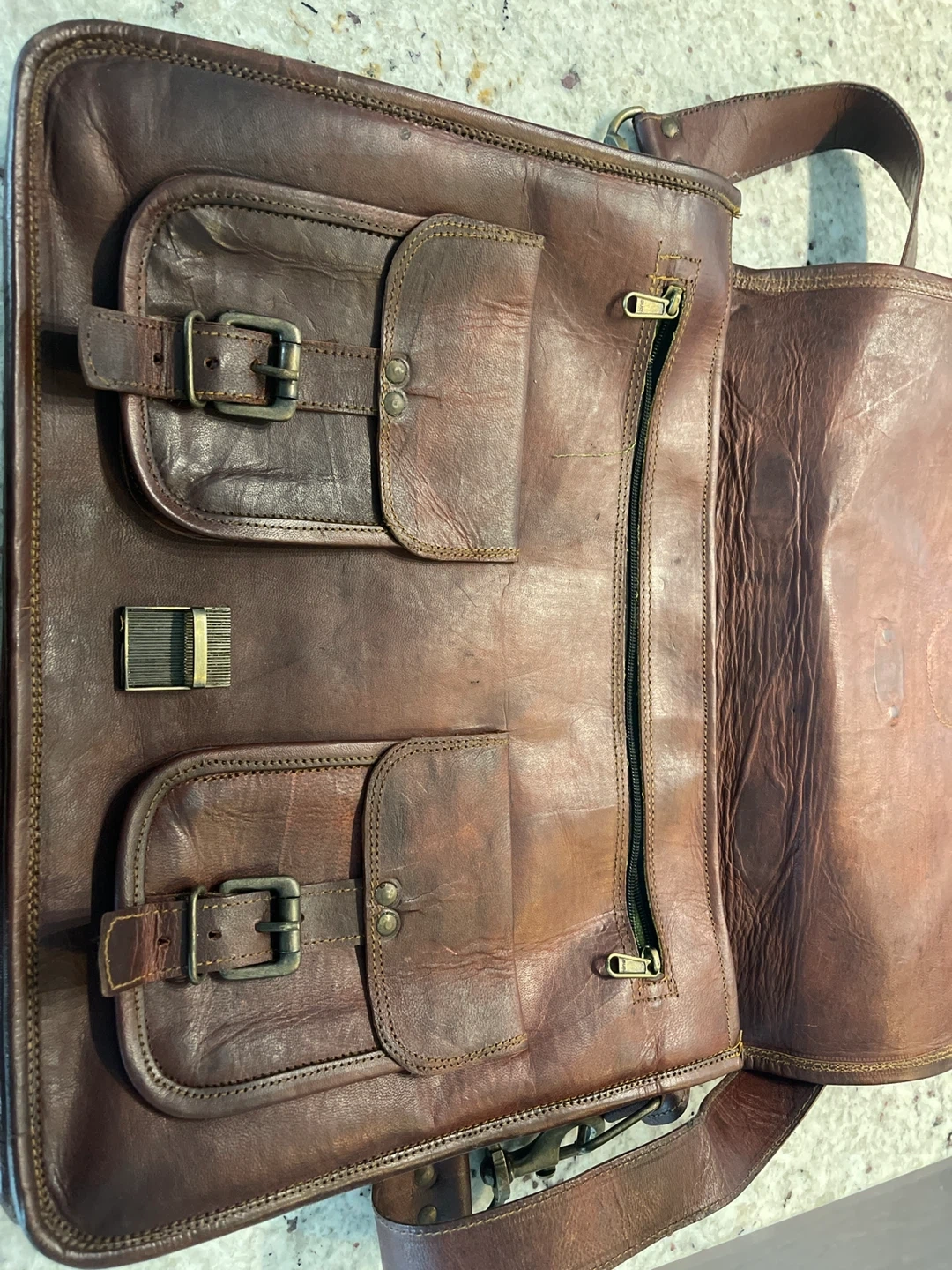 Selling a leather messenger bag. It has a few pockets and zippers. The inside is a green canvas material. It has gentle wear and tear, but it is still in good condition and looks great. Lots of interior space for a laptop and books.