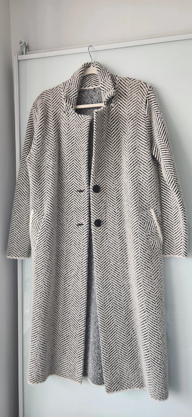 A stylish coat with a unique herringbone pattern! It features a wool blend material, making it perfect for cooler weather. The coat has a classic design with button closures and a comfortable fit. It's virtually new. Dry cleaned and ready to wear!