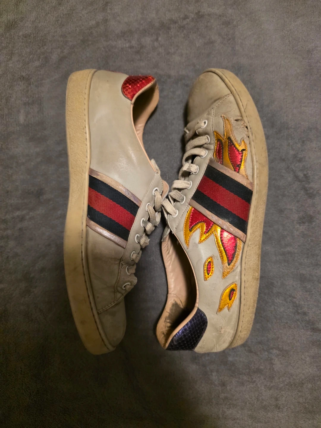 These Are Authentic Gucci Ace Flame Shoes. They Are Heavily Damaged Shoes. It Would Be For Someone Who Restores Shoes Or Requires Authentic Gucci Leather For A Project.