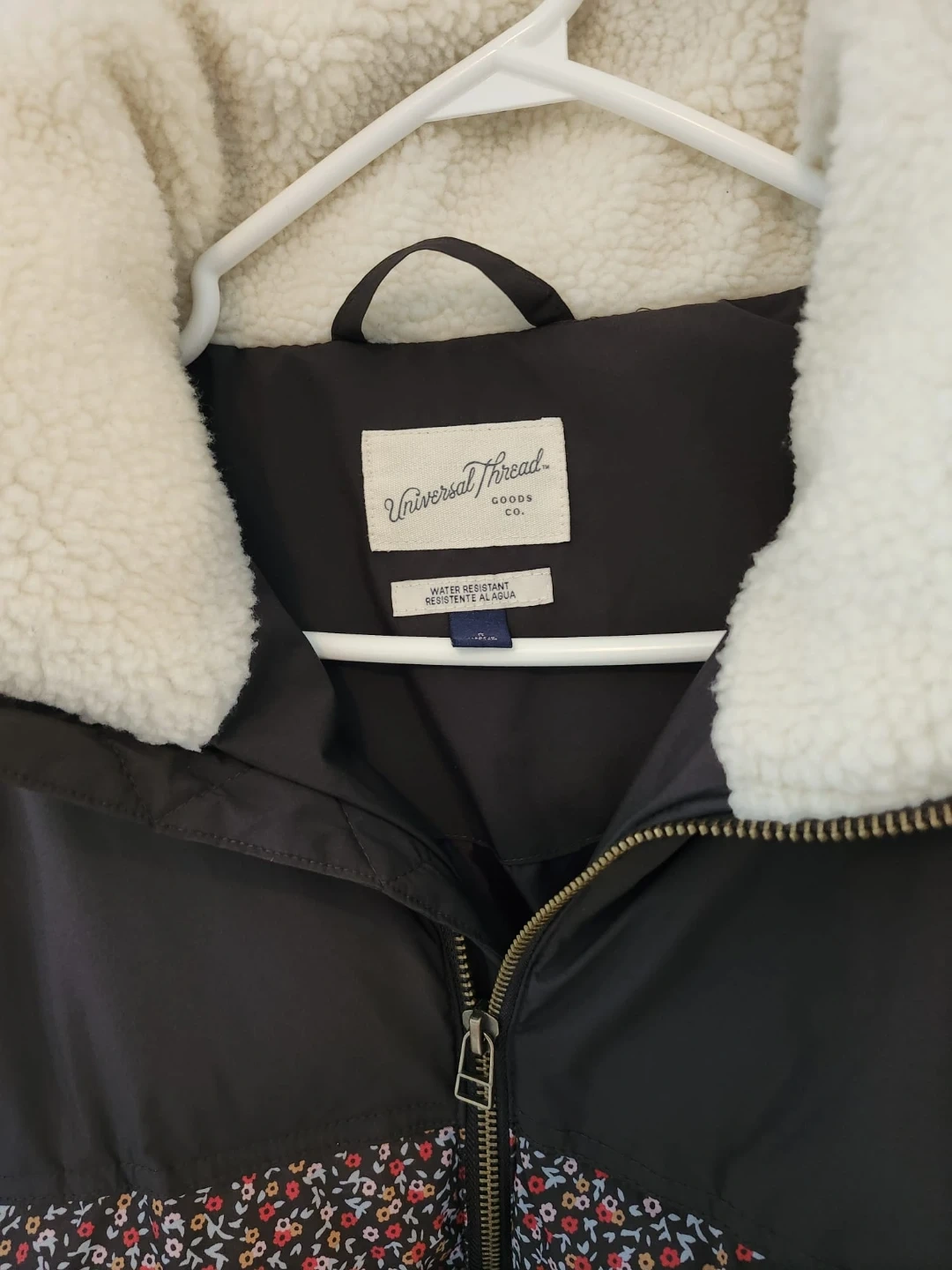 Cozy up in this Universal Thread puffer jacket! It's a size small and features a cute floral pattern on the bottom half, contrasted with a solid dark colour on top. The collar is lined with soft, fluffy material for extra warmth and comfort. Perfect for those chilly Canadian days!