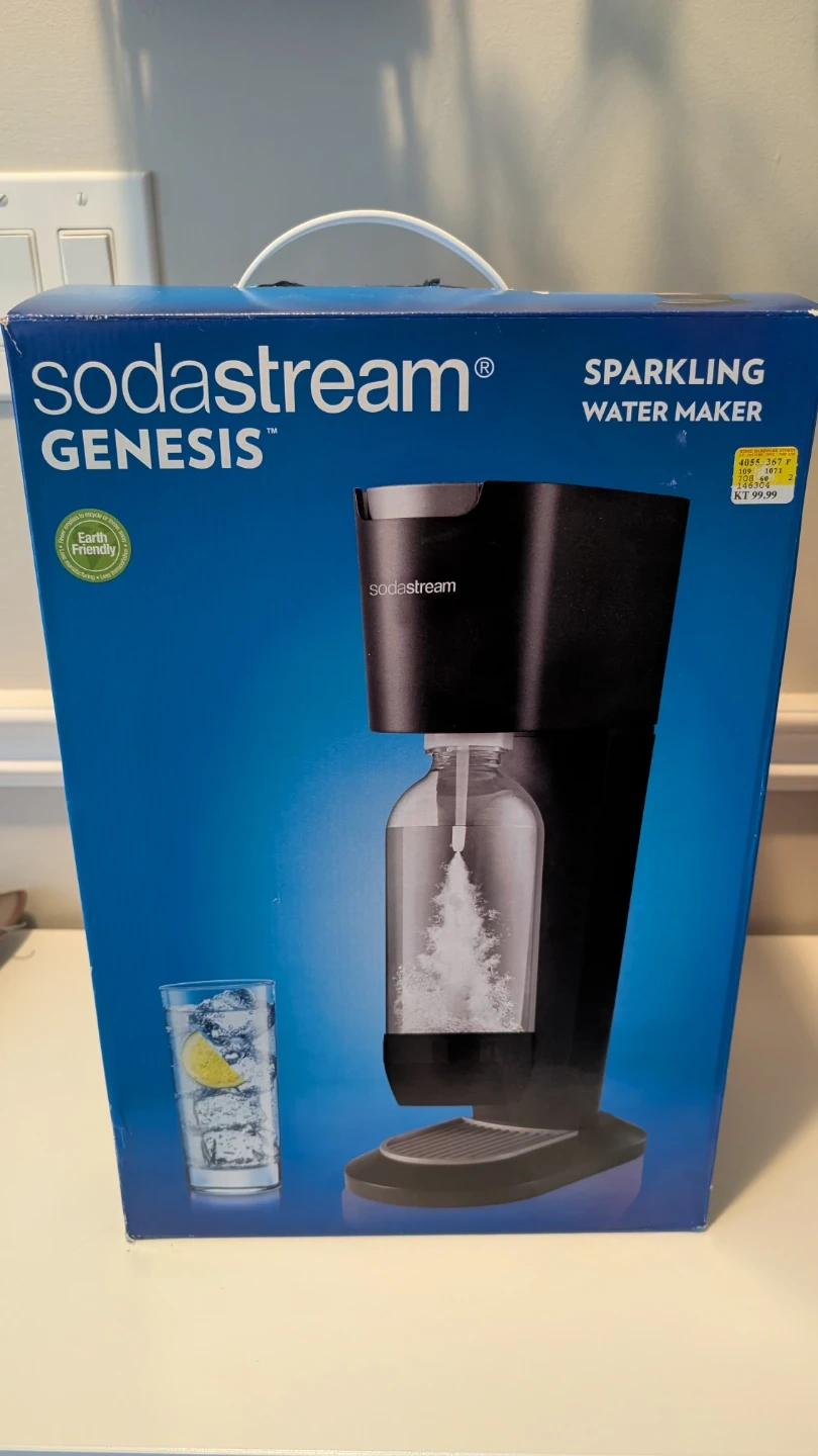 Selling a SodaStream Genesis sparkling water maker! It's in great condition and comes with the box. It's a super easy way to make your own sparkling water at home. Enjoy making fizzy drinks anytime!