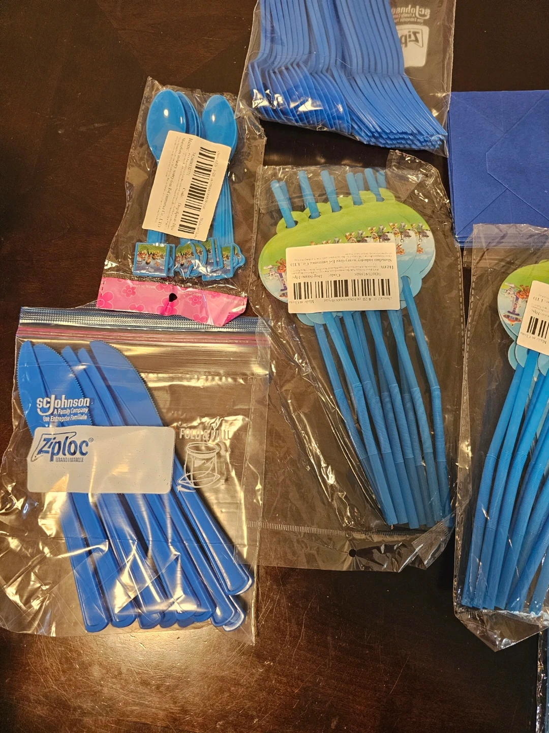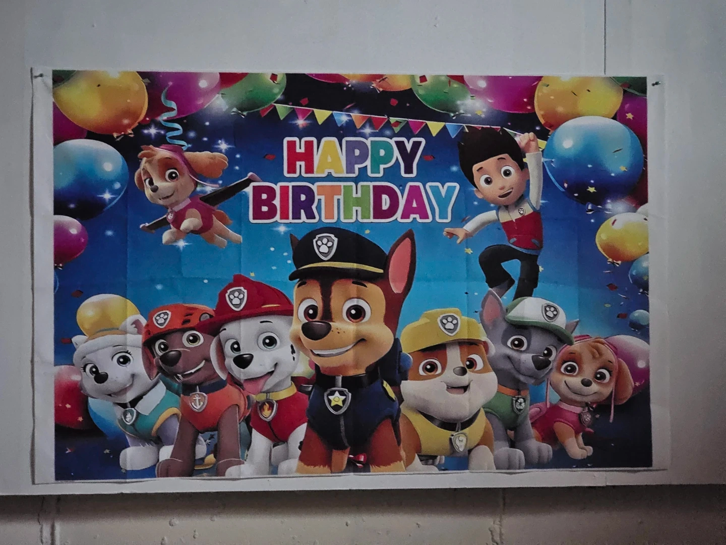 Paw Patrol themed birthday party supplies! This set includes a backdrop, party hats, masks, napkins, cake toppers, cutlery and favour boxes. Everything you need to throw a fun Paw Patrol party for your little one