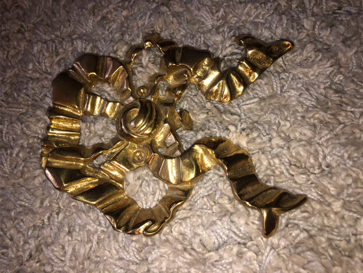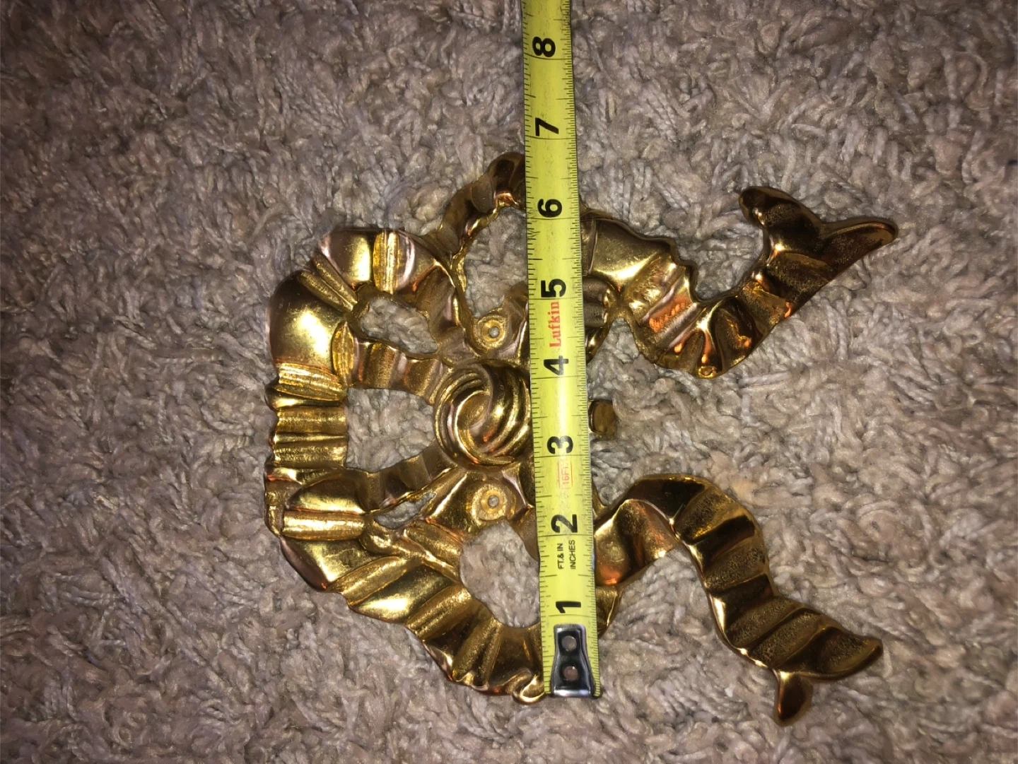 Selling a vintage solid brass bow wall hook. It's a unique piece that adds a touch of elegance to any room. The hook measures approximately 7 inches in height, making it a practical and decorative item for your home