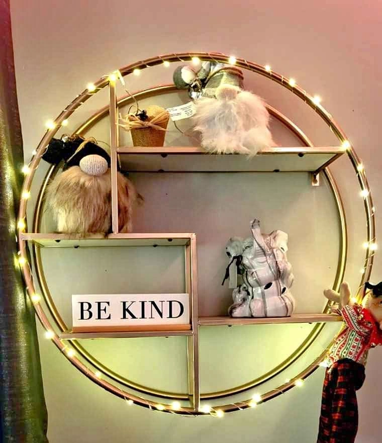 Round multi level wall shelf. Does not come with accessories. Looks great with fairy lights wrapped around.