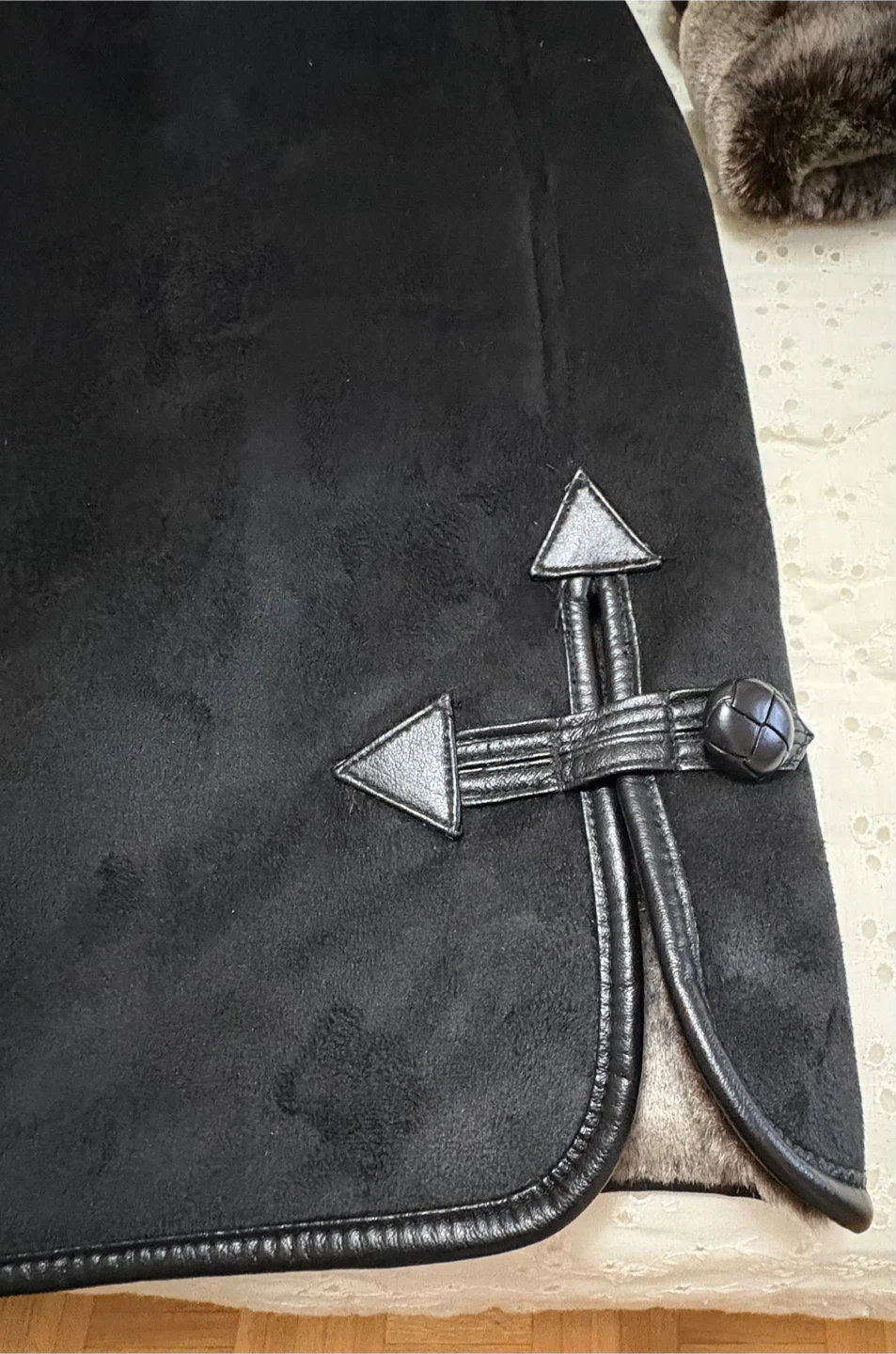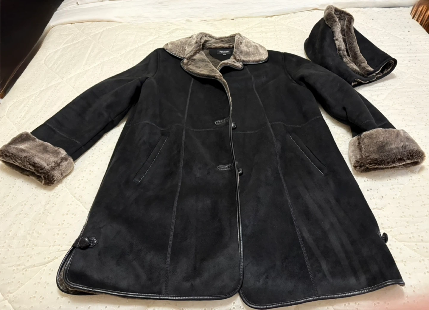 This stylish black faux suede Pennelli coat, size 13/14 features a luxurious faux fur lining and trim on the collar and cuffs, plus a detachable hood for versatile wear. This pre-owned coat is in excellent condition, ready to add a touch of elegance to your wardrobe.