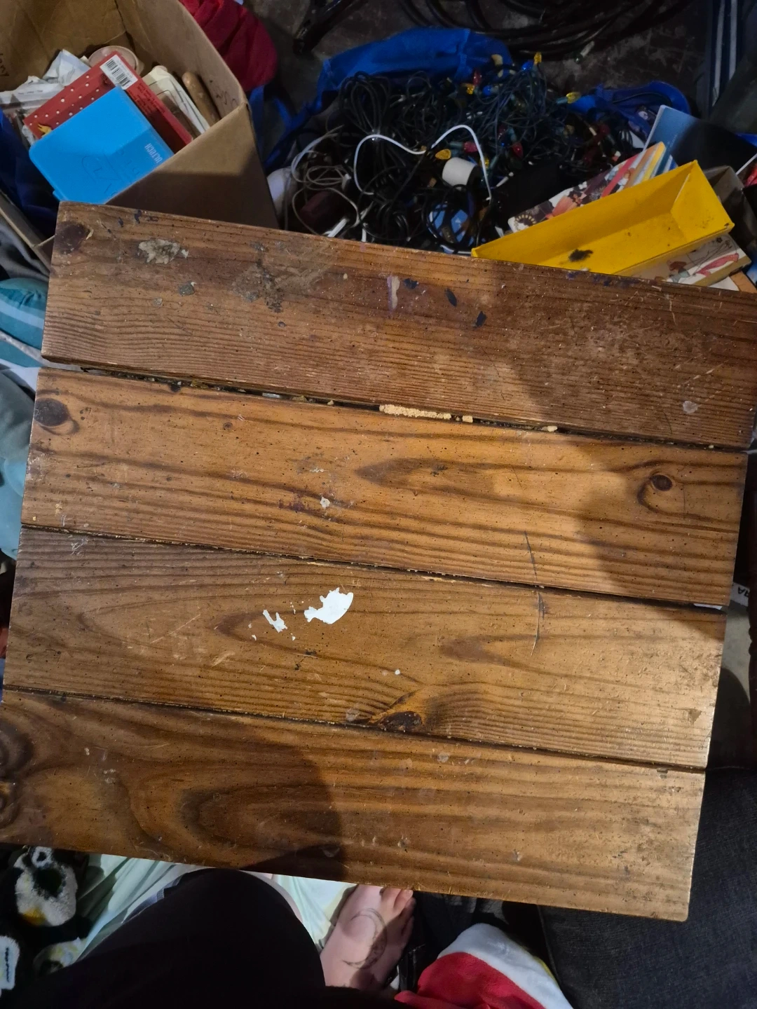 Selling a rustic wooden side table. It has a square top and a simple, sturdy frame. Perfect as a bedside table or for holding plants in your living room. It shows some signs of wear, which adds to its charm!