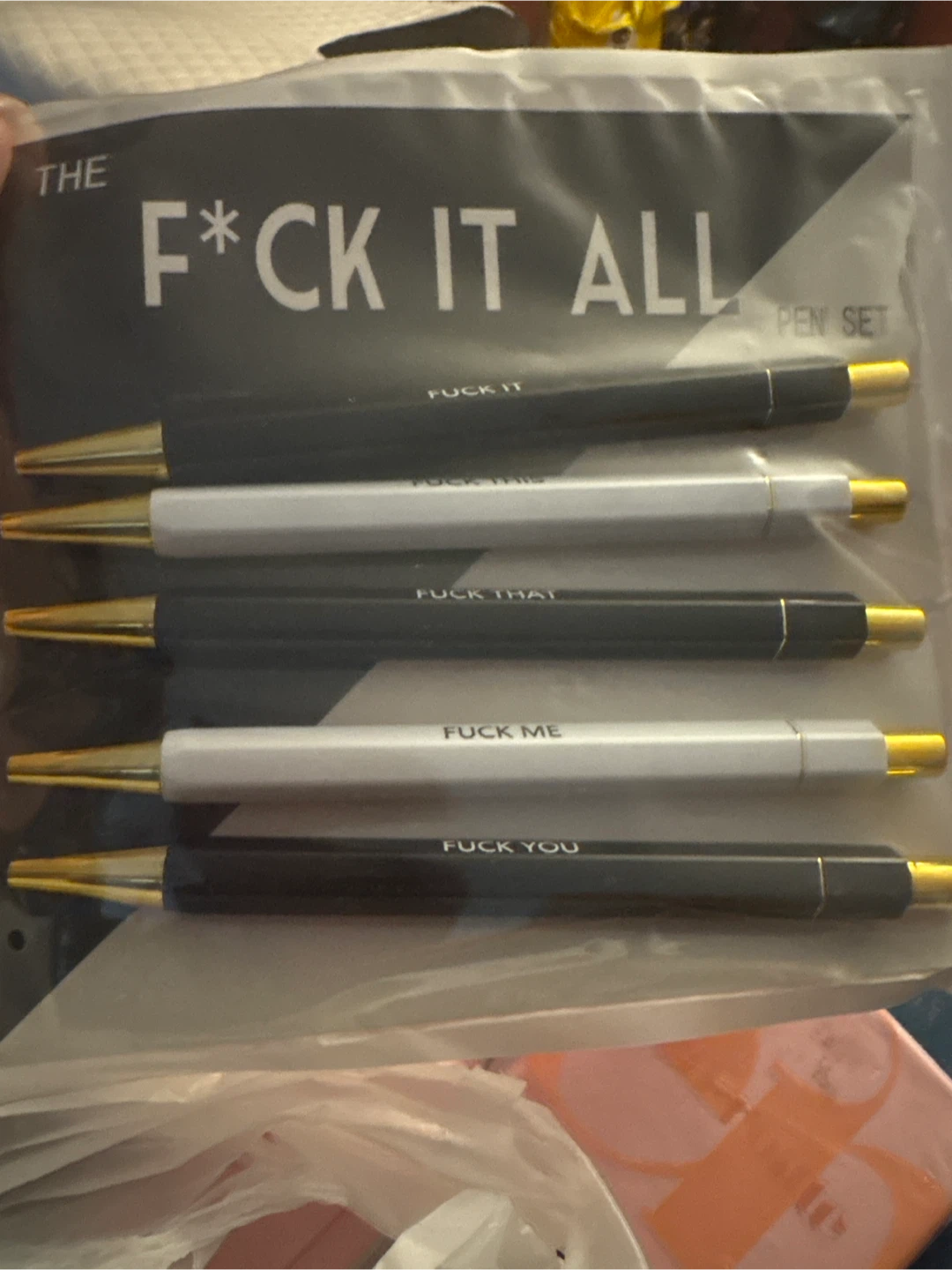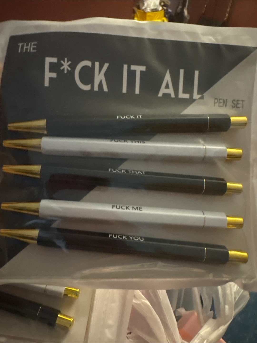 1 / 31 / 3Buy & SellA set of 5 F*CK IT ALL ball point pens NEWA set of 5 F*CK IT ALL ball point pens NEW$6A brand New set of 5 ball Point pens Black and white with the saying F it F you F me F that NewWHERE TO MEETCheck LocationView MapSELLERverifiedBellaWilliamsburg1000+969 reviews1 chatsΒ·3 favoritesΒ·18 viewsSEND CHAT TO SELLERHi Bella! Iβm interested in your listing.Hi Bella! Iβm interested in your listing.Get the Karrot app to chatSign In to chat
