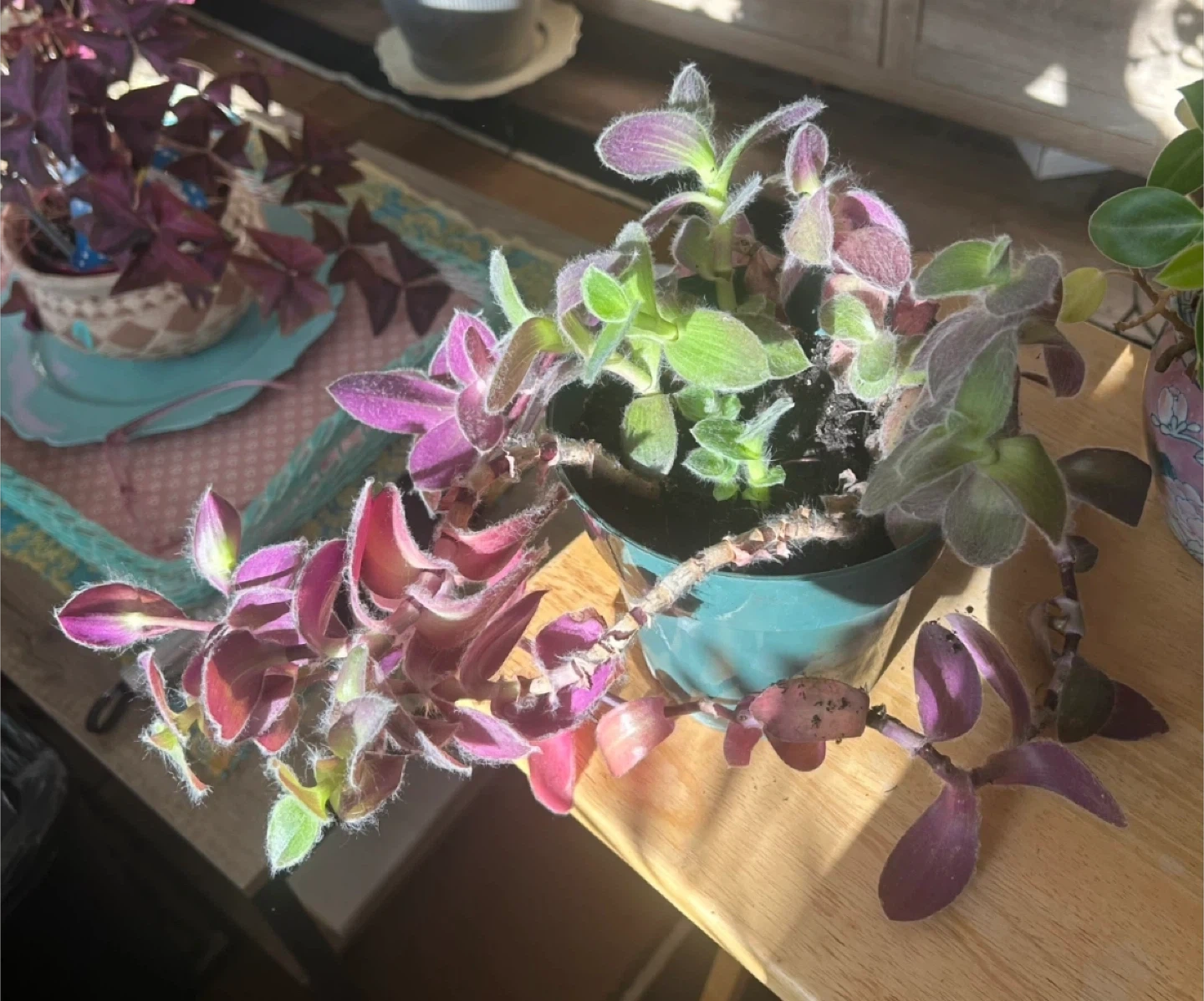 Selling a healthy Wandering Jew plant! It has beautiful purple and green leaves and is in a teal pot. It's a great addition to any indoor garden