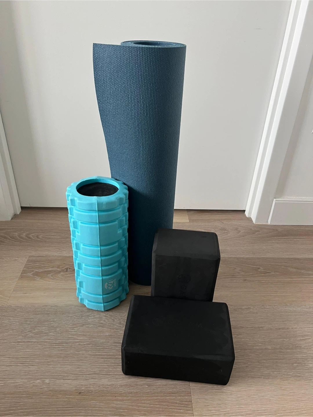 Home Yoga Kit, includes a yoga mat, two yoga blocks, and foam roller. Perfect for at-home workouts and stretching! Great condition and ready for a new home