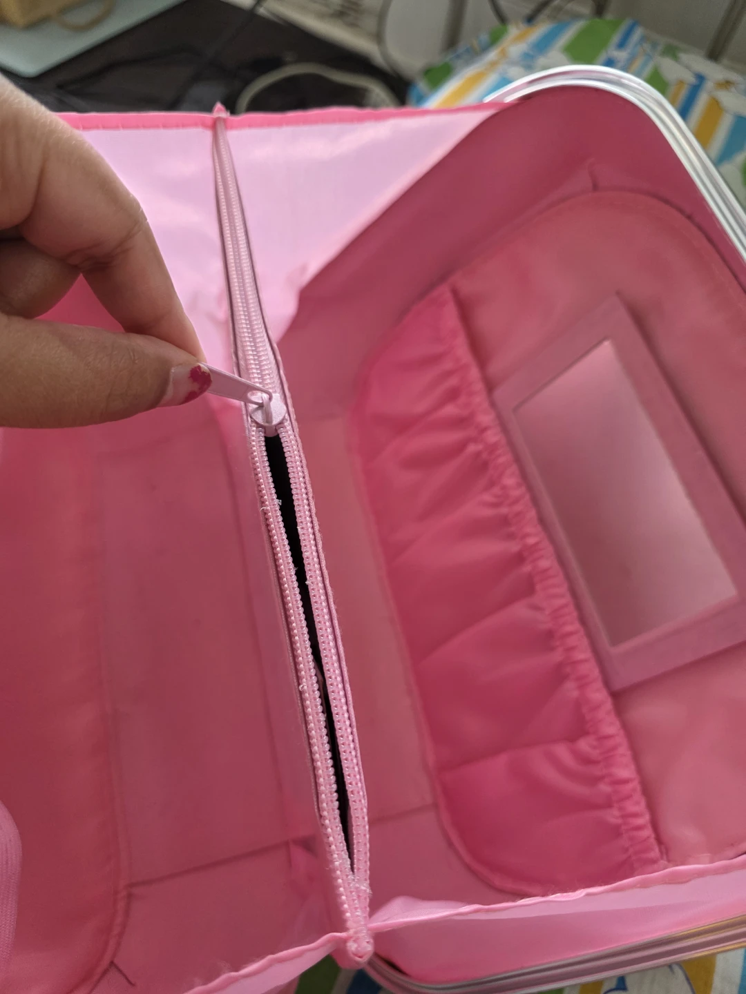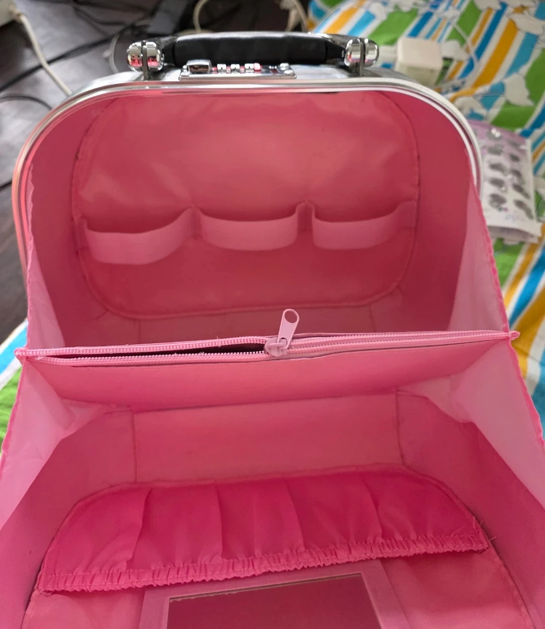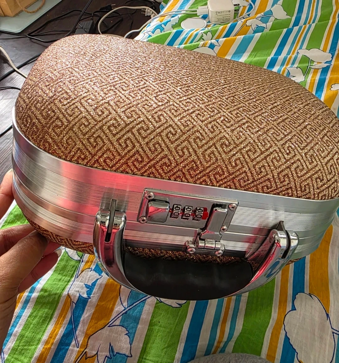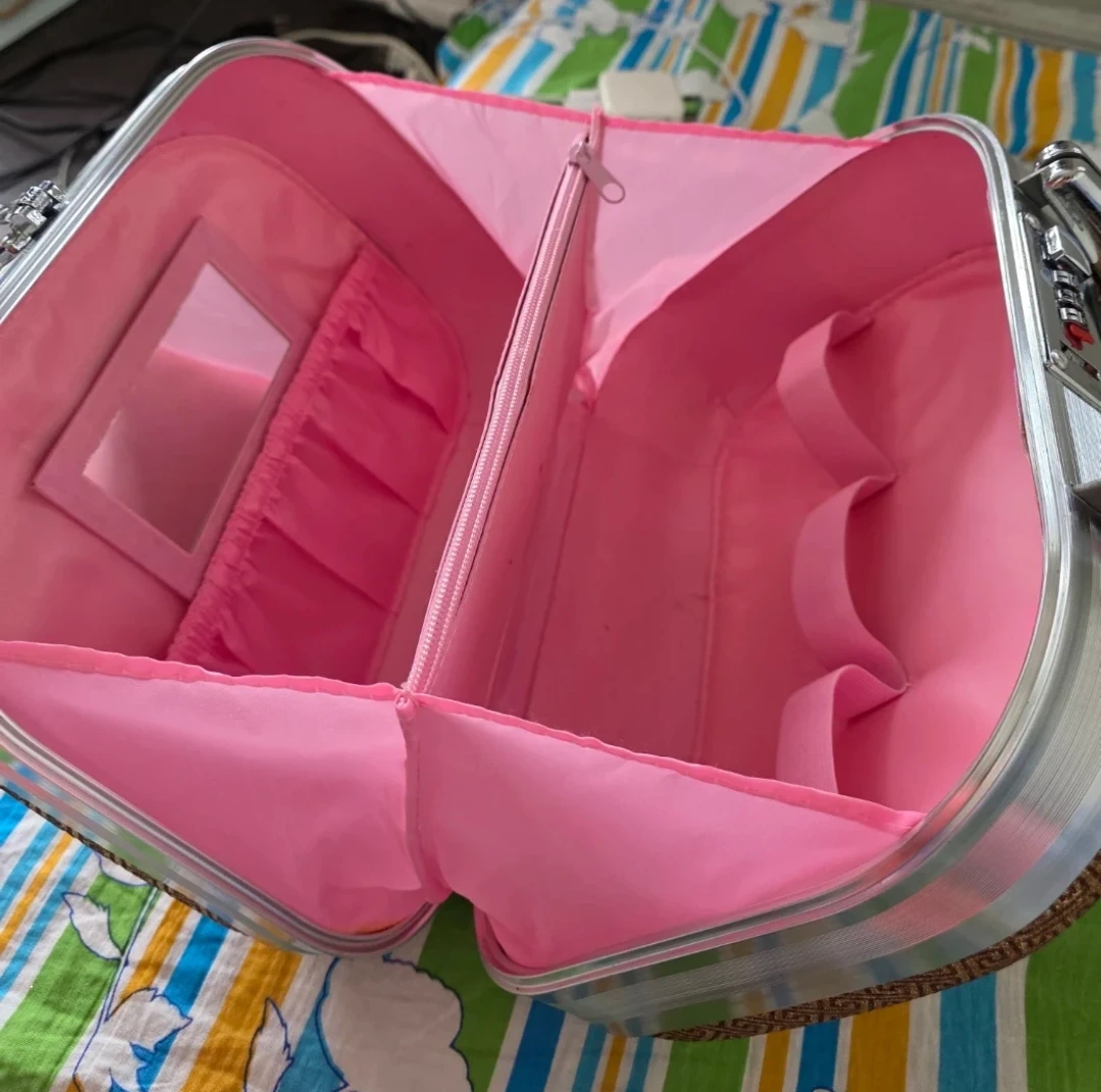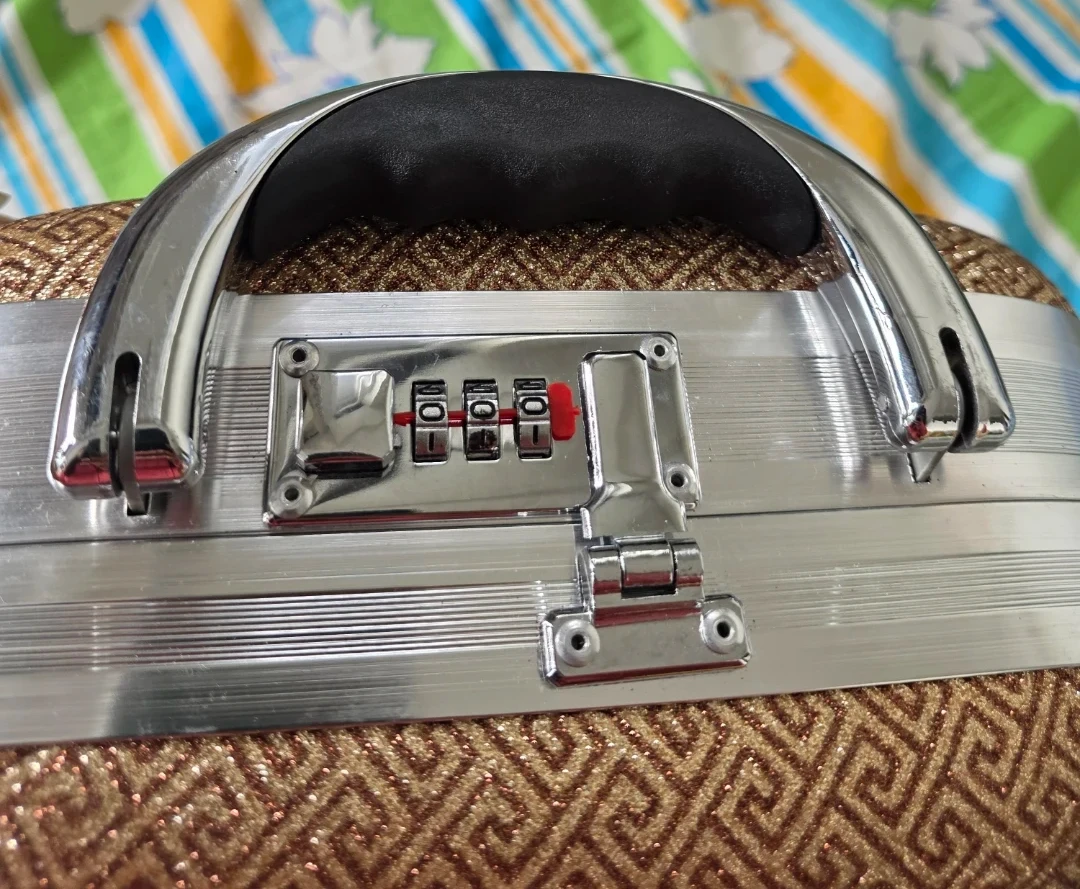 Selling a NEW vintage makeup/cosmetic case with a unique gold sparkly patterned exterior and a pink interior with a small mirror. It features a combination lock for secure storage. Perfect for organizing your beauty essentials and for traveling purposes. It is completely new, never used.
