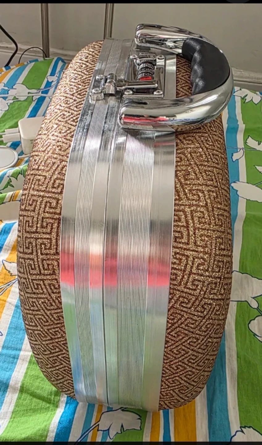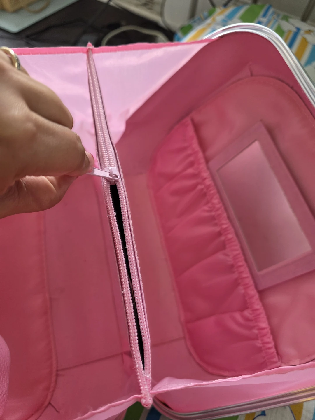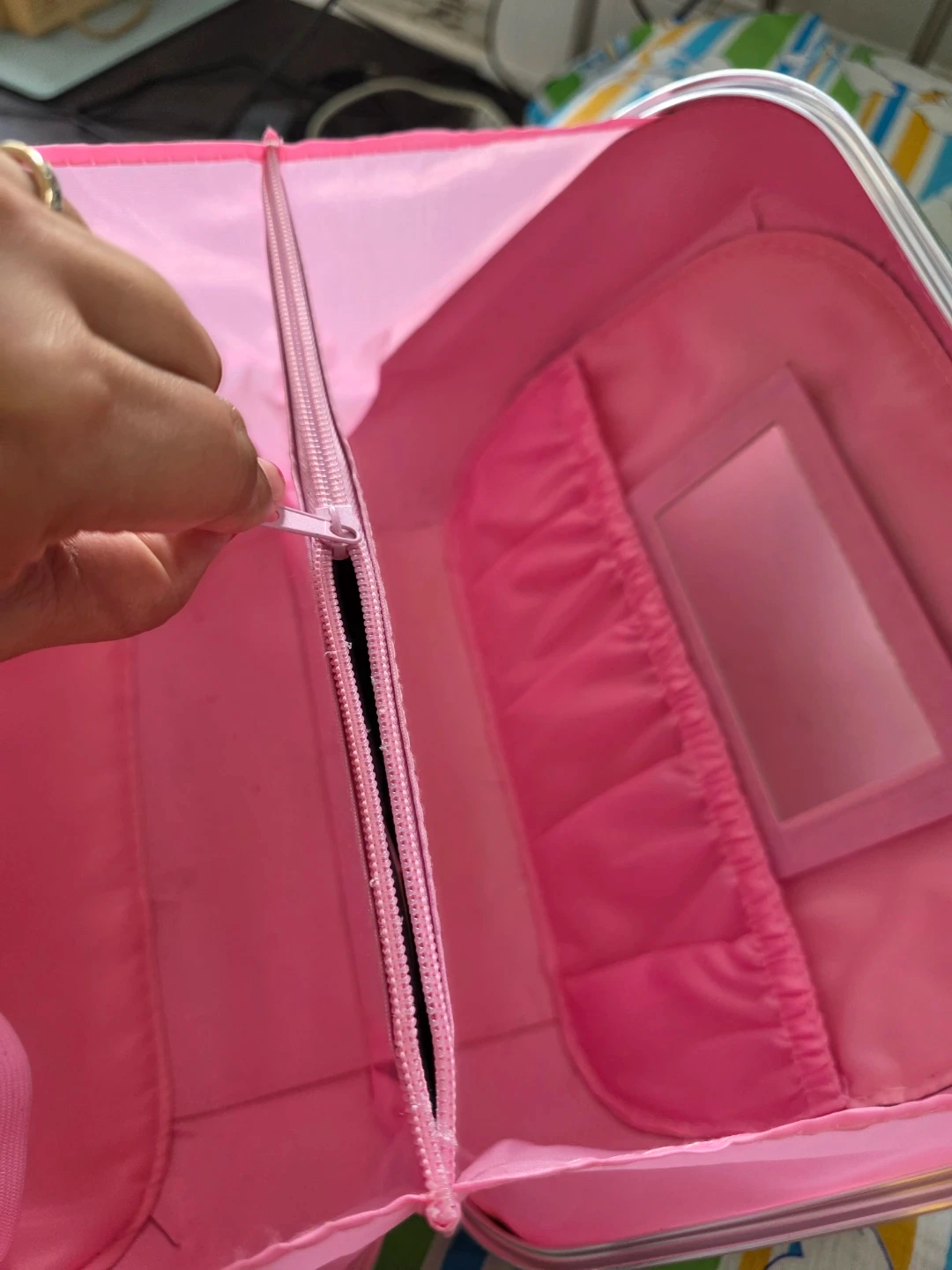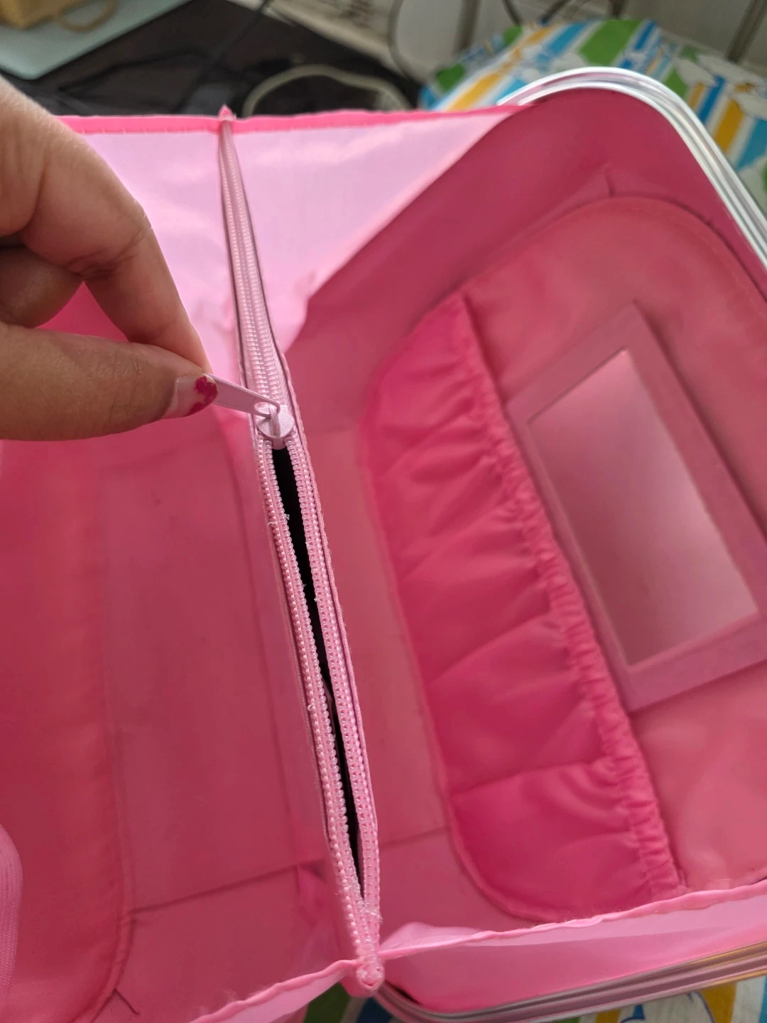 Selling a NEW vintage makeup/cosmetic case with a unique gold sparkly patterned exterior and a pink interior with a small mirror. It features a combination lock for secure storage. Perfect for organizing your beauty essentials and for traveling purposes. It is completely new, never used.