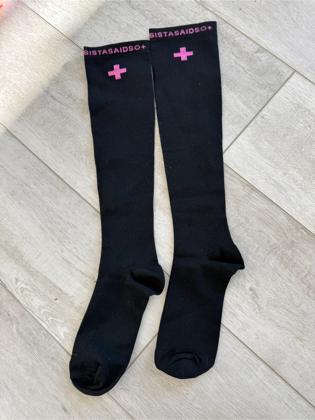 Selling a pair of black compression socks from Sista Aidso+. They feature the brand's name and logo in pink near the top of the sock. Great for anyone looking for stylish and supportive compression wear! Never worn!