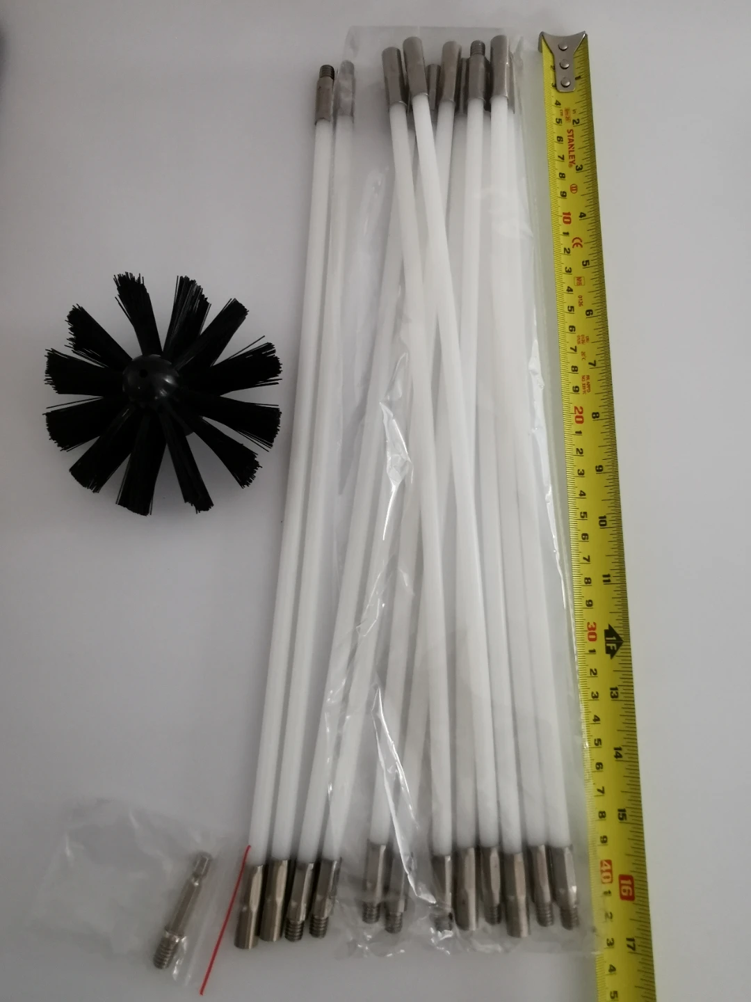 This chimney sweep kit is brand new and ready to help you keep your chimney clean and safe! The kit includes 12 flexible rods that can be easily connected to extend your reach, along with a durable brush head designed to effectively remove soot and debris. Regular chimney maintenance is essential for preventing fires and ensuring efficient heating, so grab this kit and sweep away your worries. The rods are 16 inches in length each and the brush head is 4 inches in diameter.