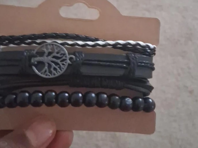 Selling a set of men's bracelets in black tones. The set includes a variety of styles, including braided, beaded, and a leather-style bracelet with a tree of life charm. Perfect for adding a touch of style to any outfit!