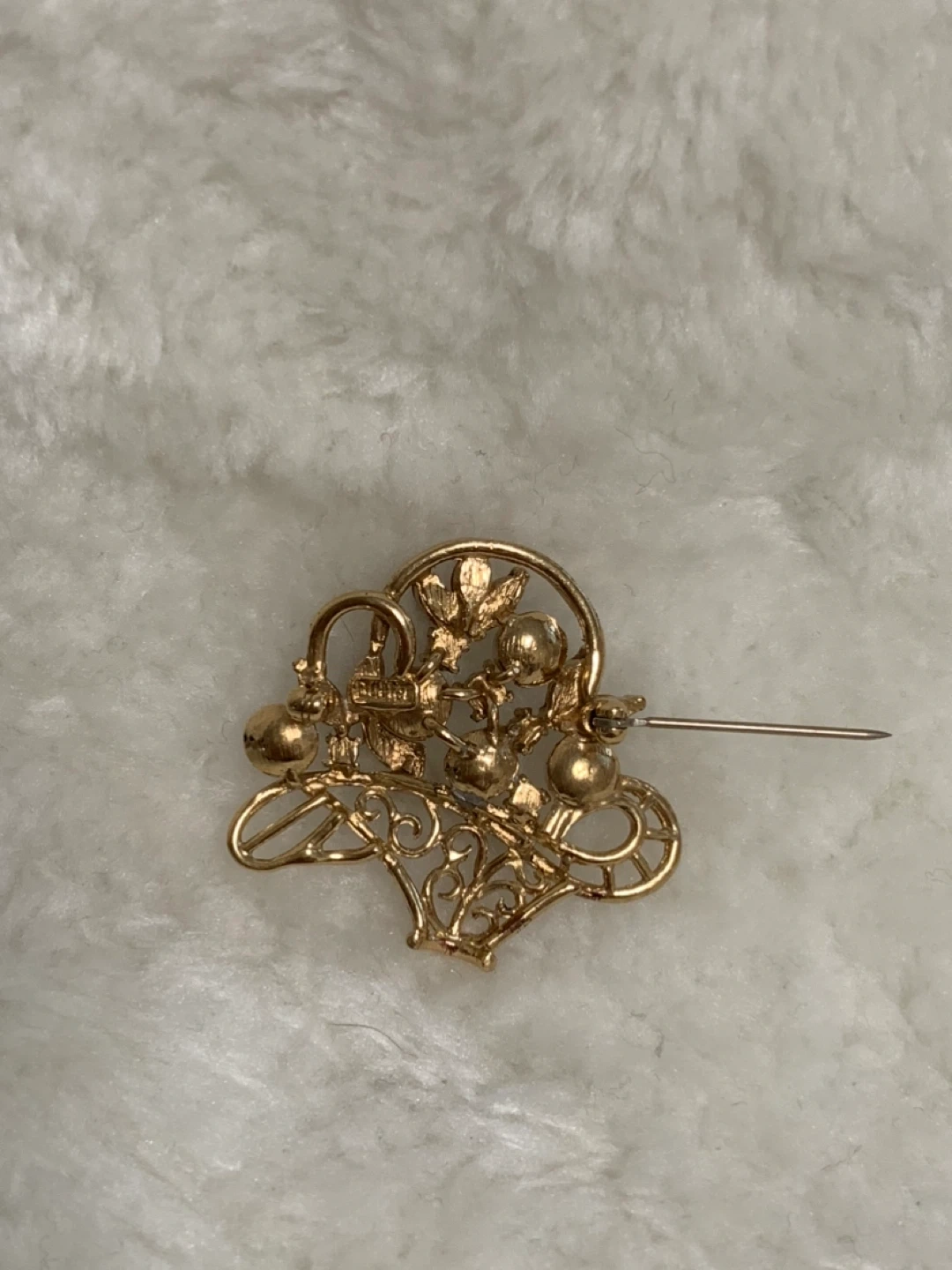 This is a lovely vintage Butler brooch featuring a gold-tone floral hat design. It's adorned with faux pearls and red stones, adding a touch of elegance. The brooch measures approximately 2 inches in length.