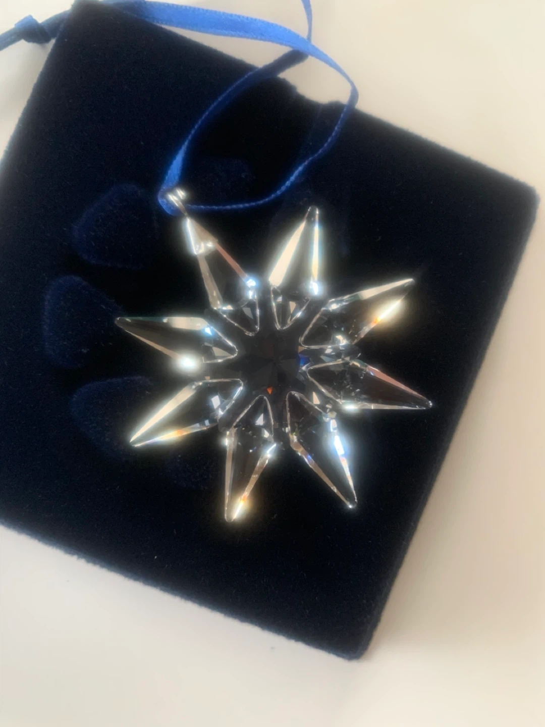 This retired Swarovski ornament is made from faceted clear crystal. The little 2009 star comes on a blue satin ribbon.