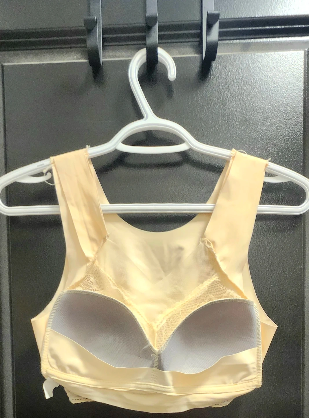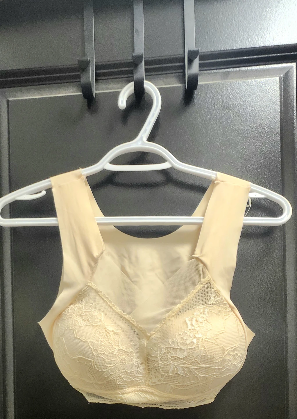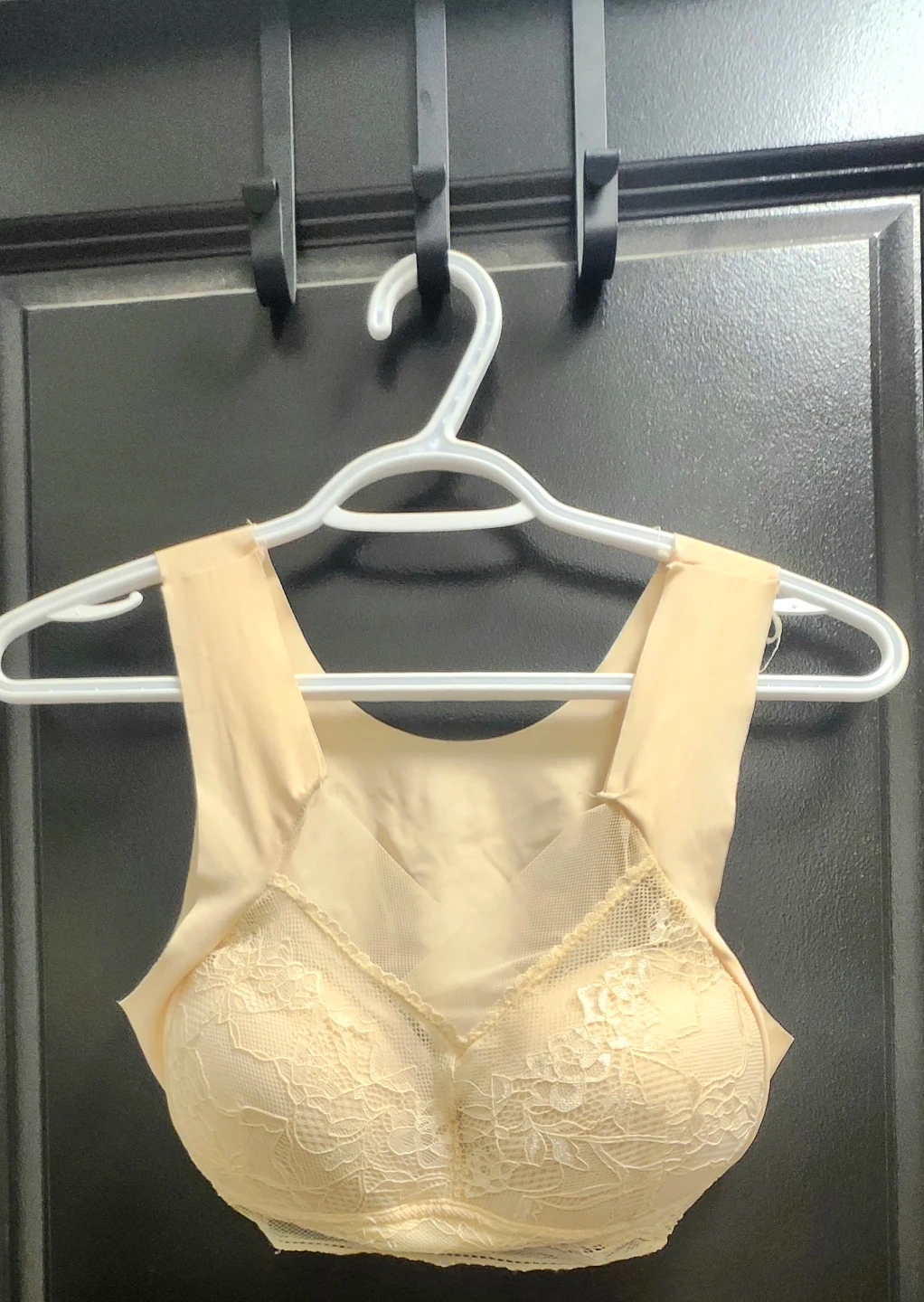 This is a gently used, beige-coloured lace bra in size medium, offering both comfort and support. It's in great condition and ready for a new home.