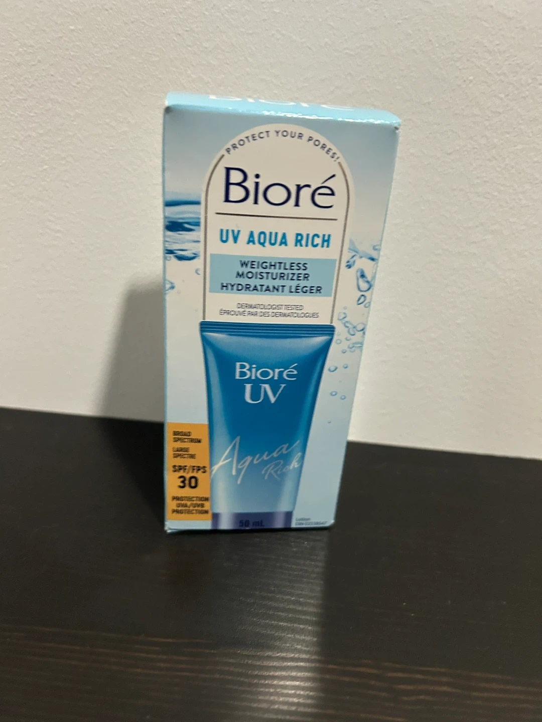 Selling a new Bioré UV Aqua Rich Weightless Moisturizer with SPF 30! This lightweight moisturizer provides broad spectrum UVA/UVB protection and comes in a 50 ml size. It's dermatologist tested and comes in its original box