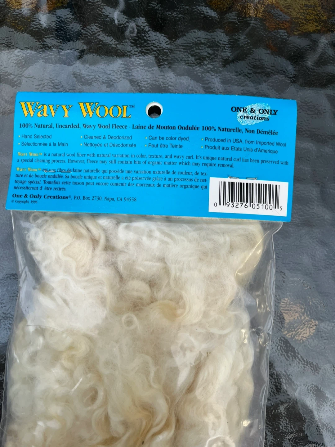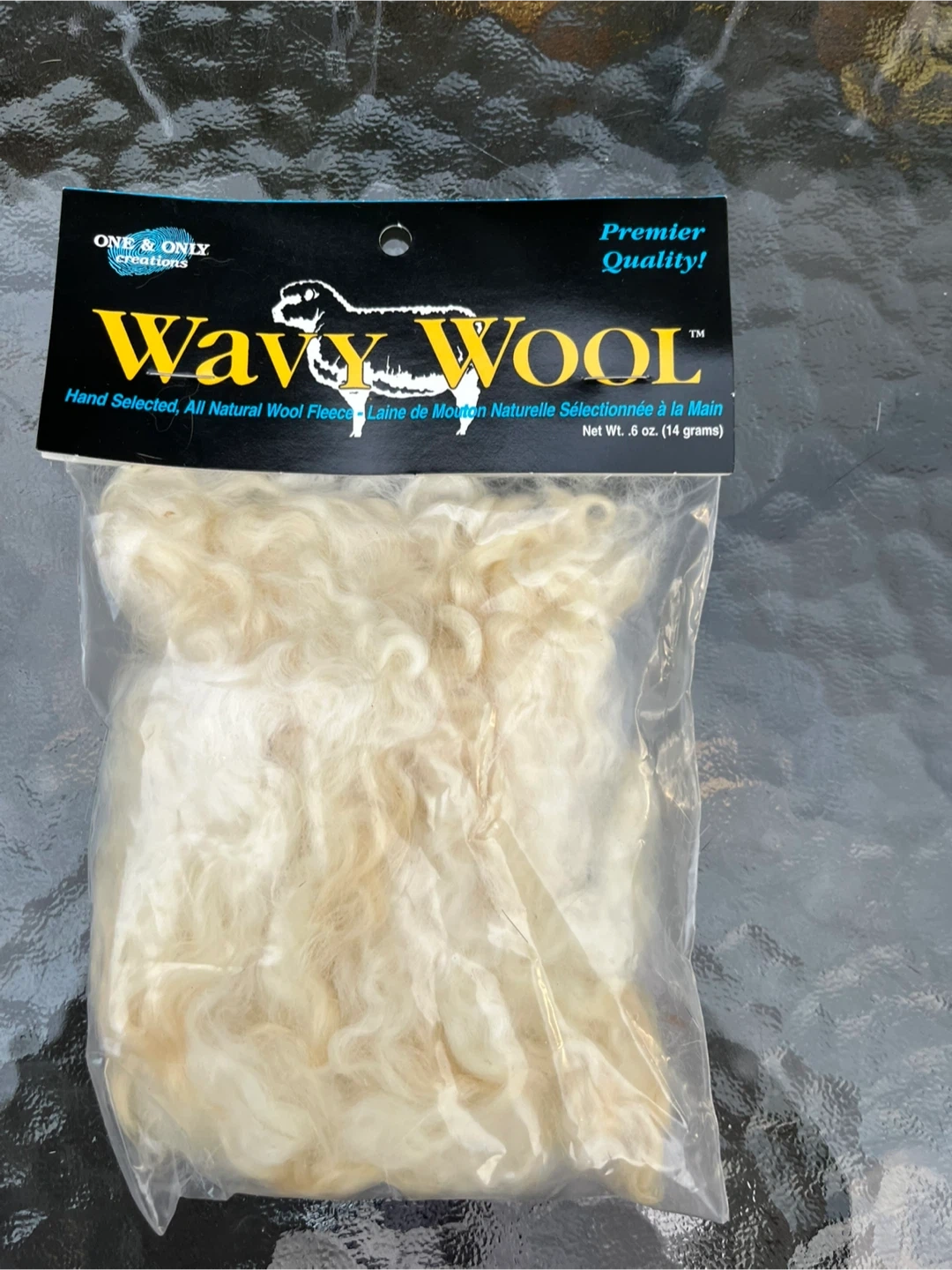 96Selling a package of One & Only Creations Wavy Wool! It's hand selected and all natural wool fleece. This wavy wool is cleaned and deodorized and can be color dyed. Net weight is .6 oz (14 grams)