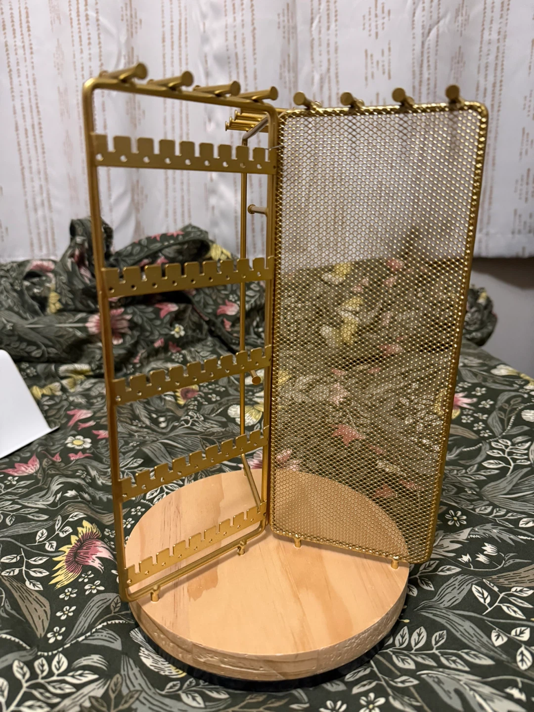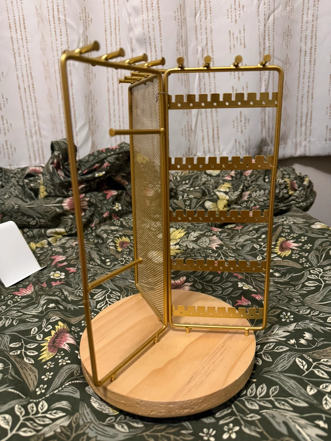 Selling a gold metal rotating jewelry holder! It's a great way to keep your earrings, bracelets, and necklaces organized and displayed nicely. The base is made of wood and the metal is a lovely gold colour. Don't need this anymore. Looking for a new home for this. In excellent pre-loved condition. Like new!