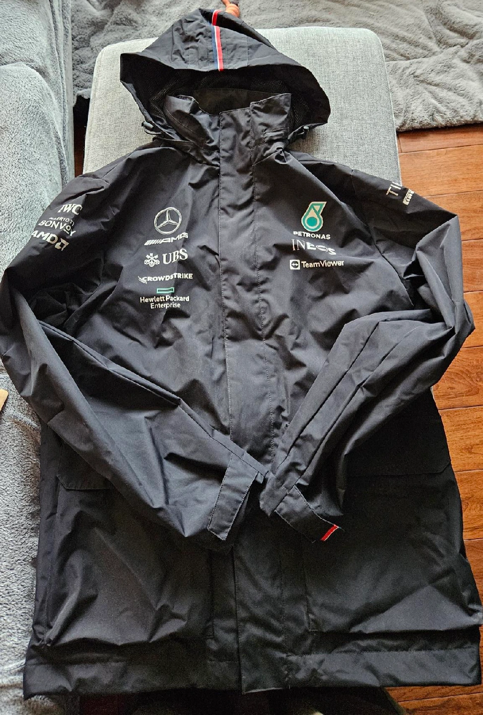 Selling a Stichd Mercedes Petronas F1 rain jacket in size L. It's in great condition and perfect for any Formula 1 fan!