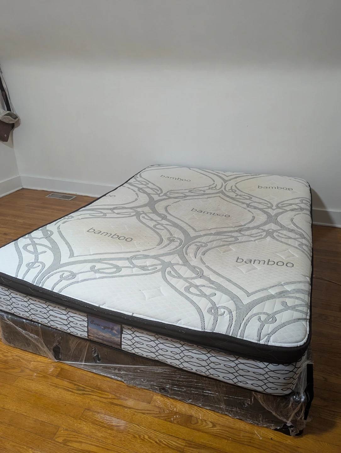 Queen spring mattress + box spring with pillow-top. Clean and well-kept — no pets, no smoking, no bed bugs. Some normal fabric fading in the center from use, but still supportive and comfortable. Comes with a matching box spring.