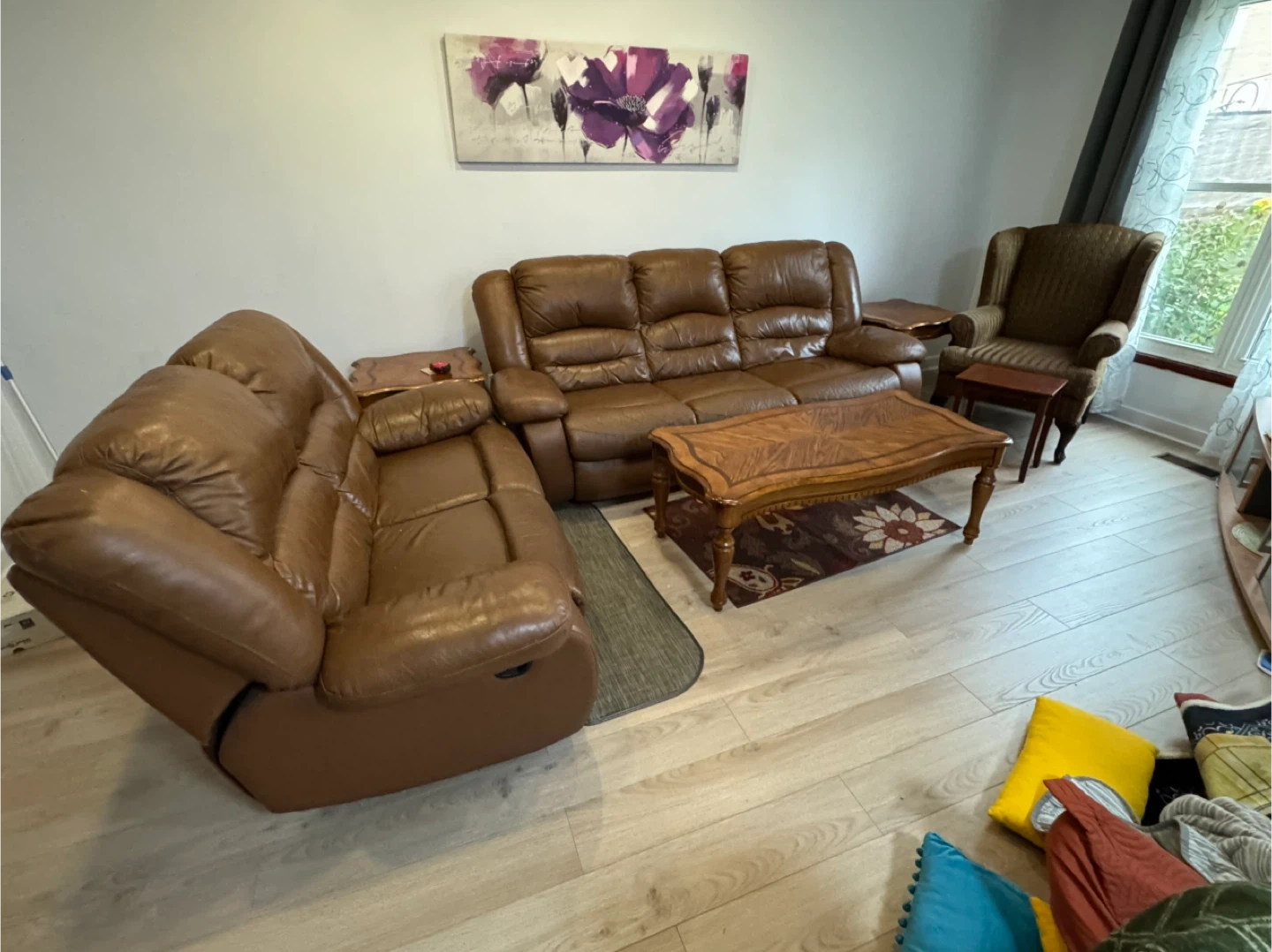 Selling a comfy brown leather reclining sofa set. It features a three-seater sofa The leather is in good condition and the reclining function works great