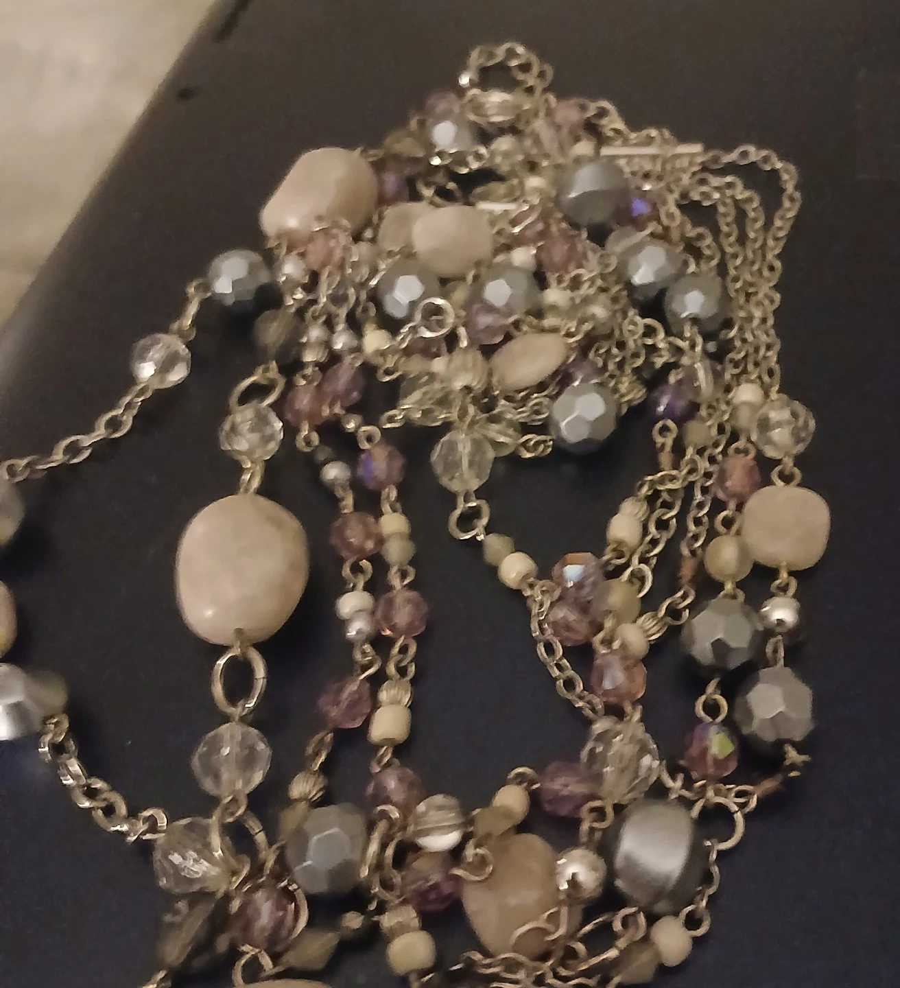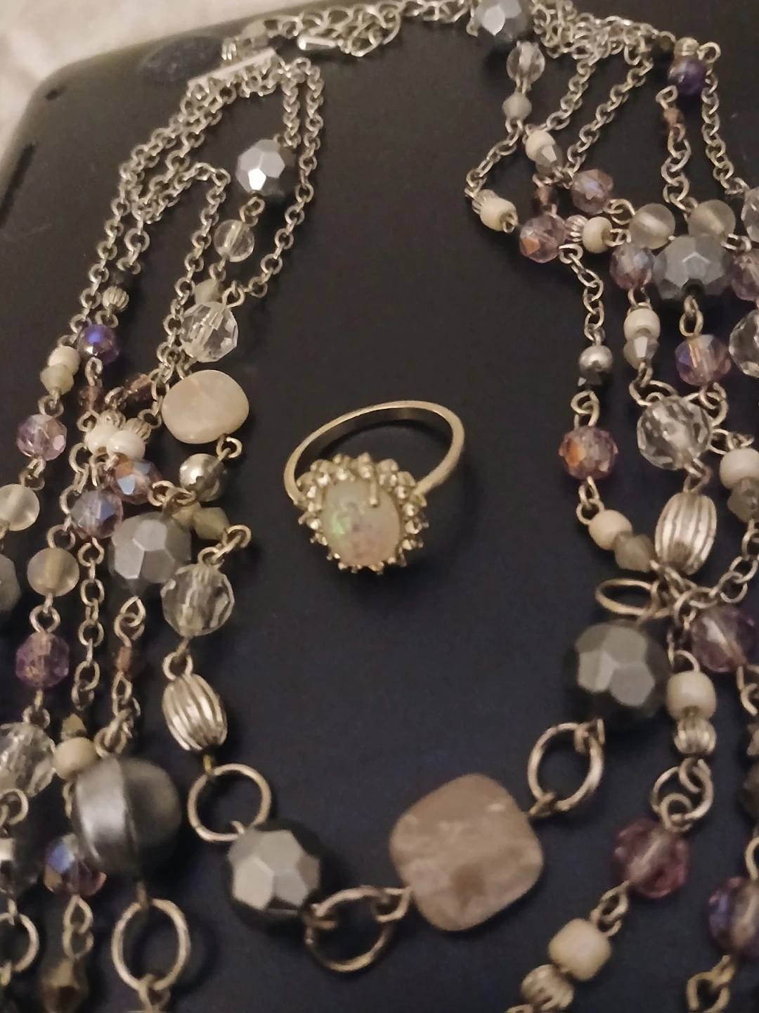 Selling a lovely necklace and ring set. The necklace features multiple strands with beads in shades of grey, purple, and beige. The ring has a opal like stone