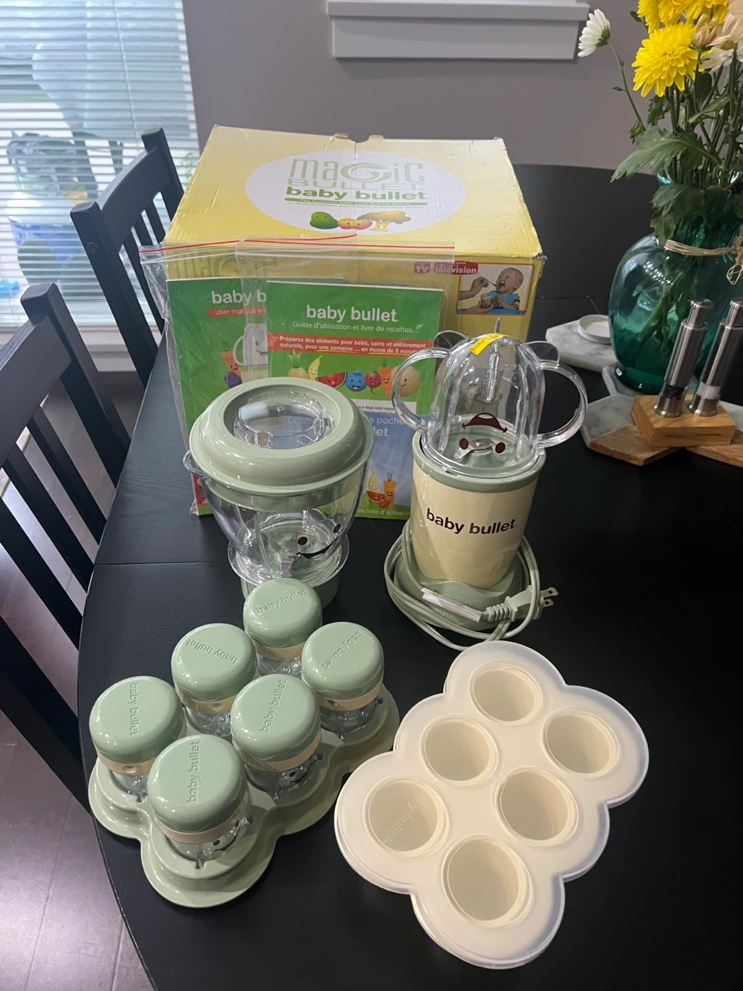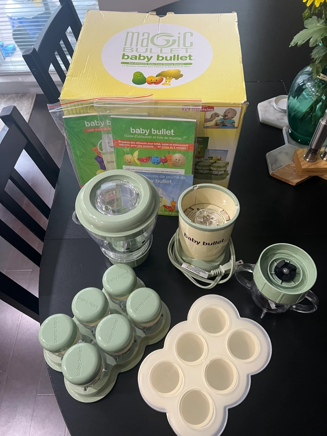 Magic Bullet baby food maker set in excellent condition! This complete baby food making system includes everything you need to make fresh, healthy food for your little one. The set includes a high-torque power base, batch bowl, baby blend blade, six date-dial storage cups, a freezer tray, and recipe book. Box included!