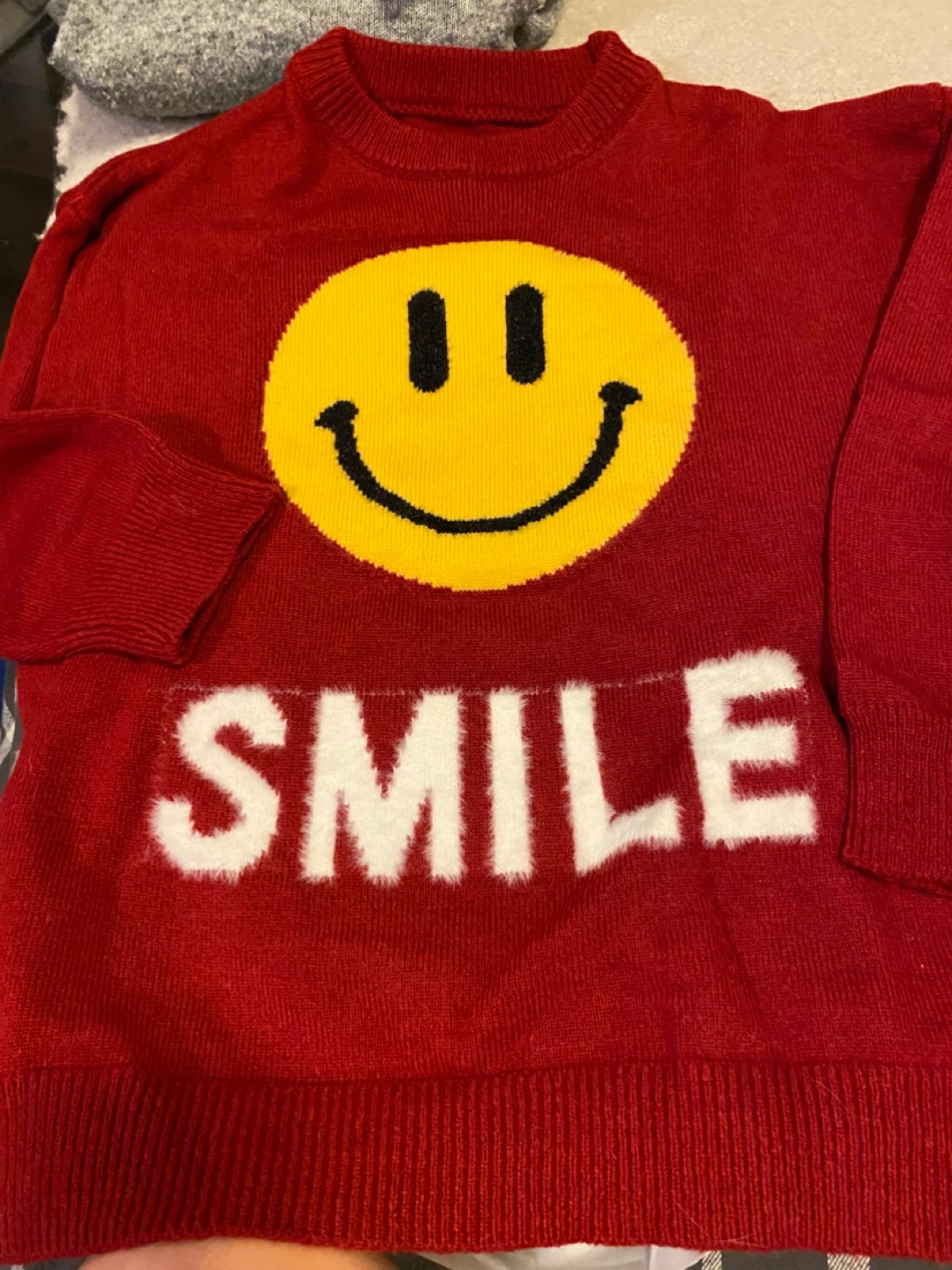 Cozy up in this fun red sweater from Hoodies for Heroes! It features a large yellow smiley face and the word 'SMILE' in white fuzzy letters. Perfect for adding a bit of cheer to your day!