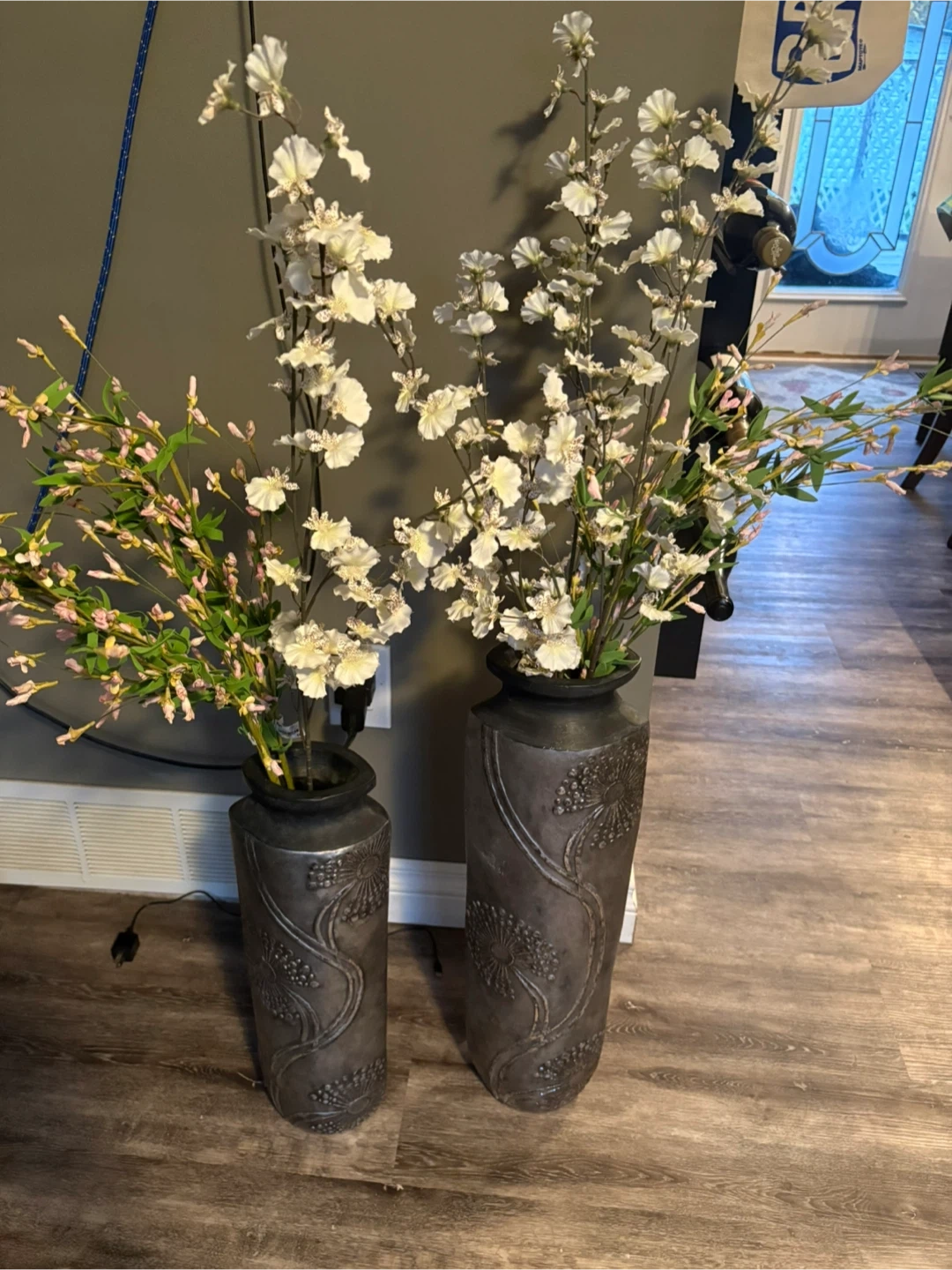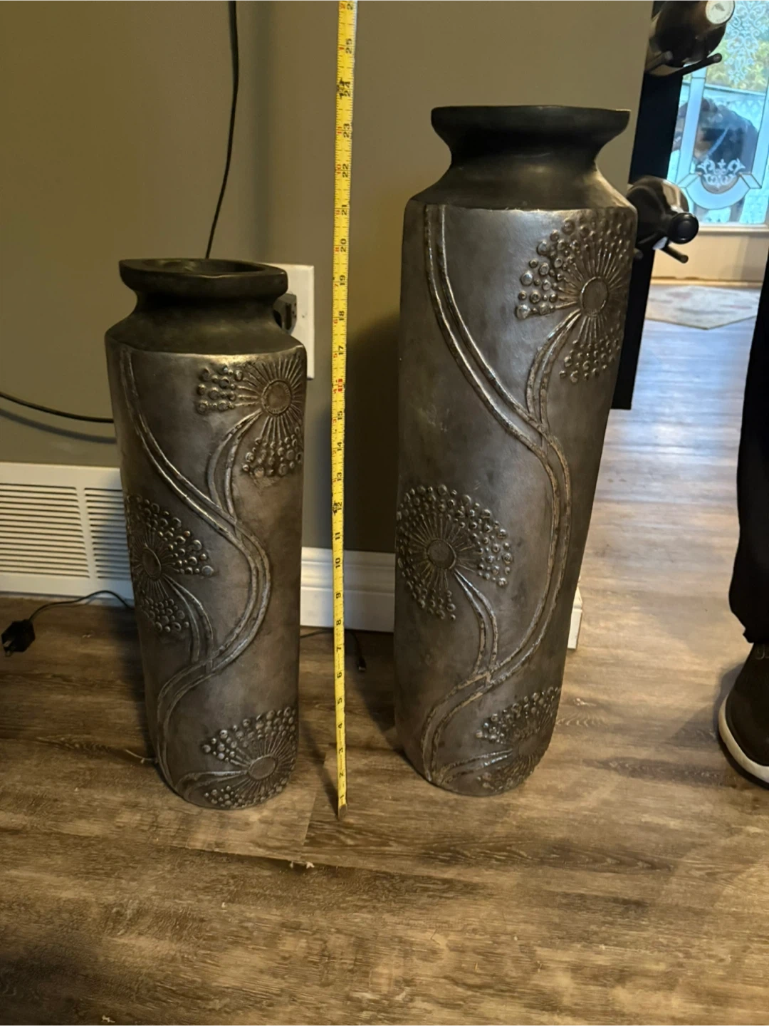 5Selling a set of two decorative floor vases. They have a unique floral pattern and a rustic, metallic finish. The larger vase is approximately 27 inches tall, while the smaller one is around 22 inches. Perfect for adding a touch of elegance to your living space!