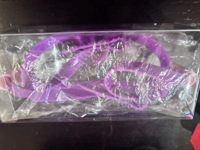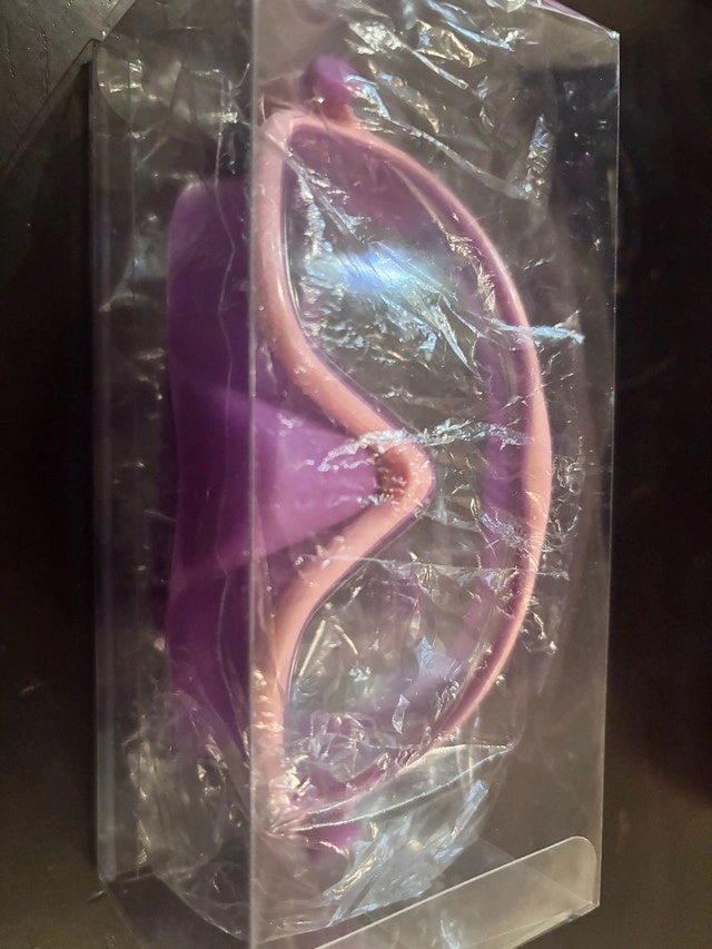 122I am selling a brand-new pair of children's swim goggles, still sealed in their original packaging. These goggles feature a comfortable, adjustable strap and are designed to provide a clear view underwater, perfect for young swimmers. They come in a fun purple and pink colour.