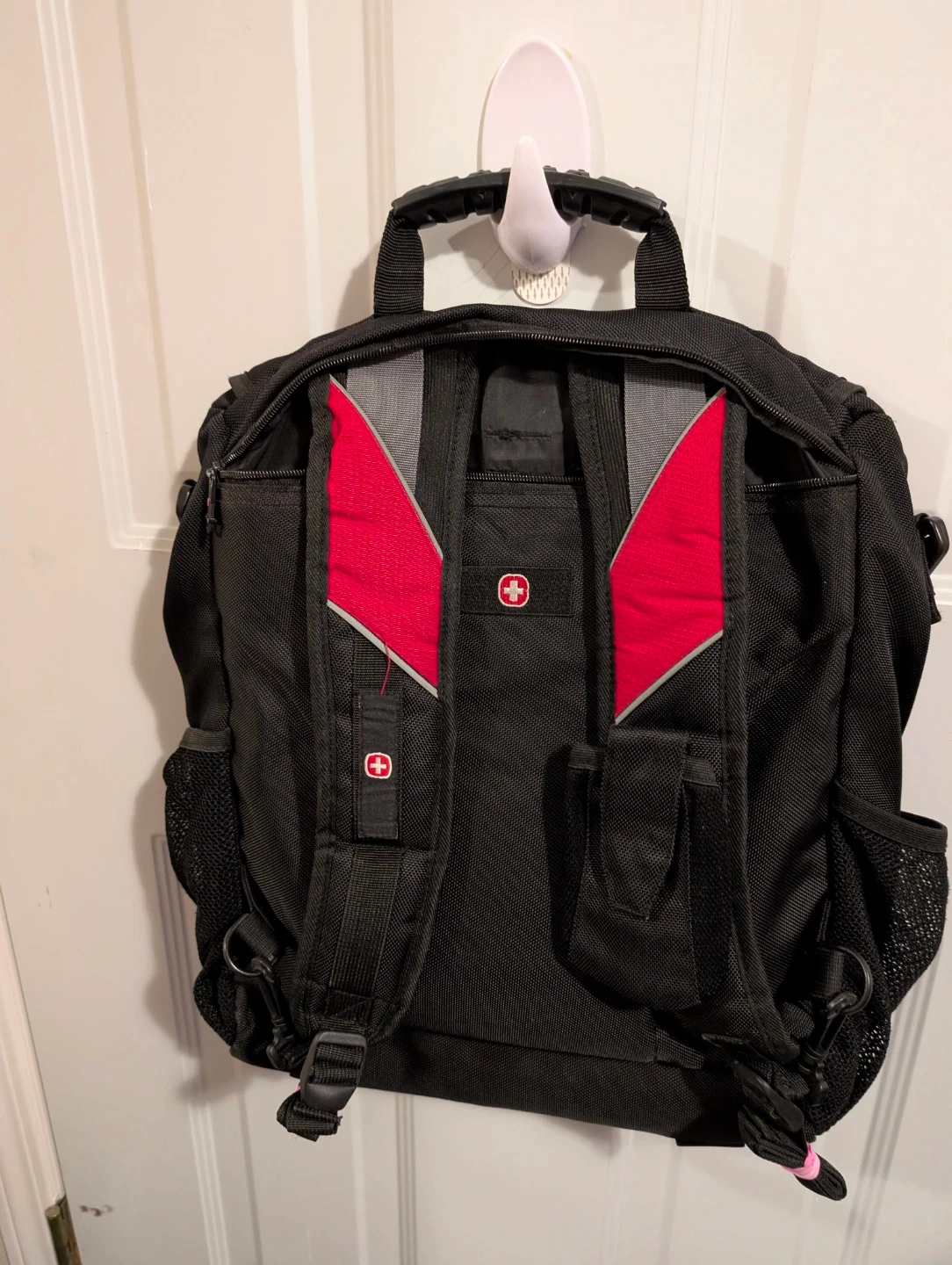 Selling a SwissGear backpack in black with red accents. It's in great shape and ready for a new owner! Features include multiple compartments and adjustable straps.