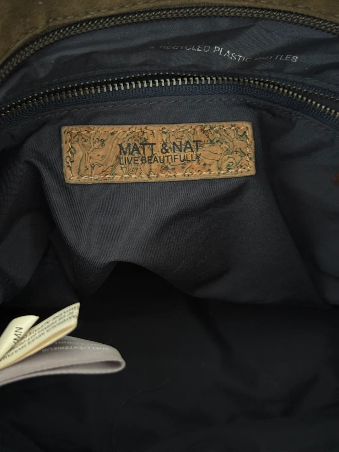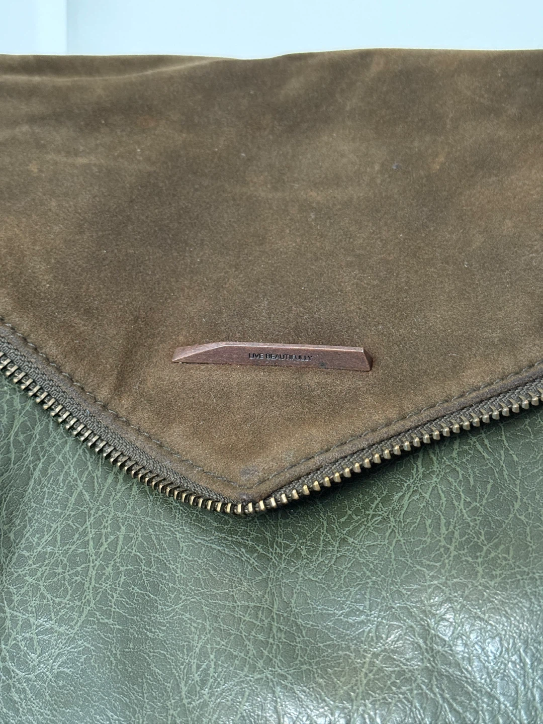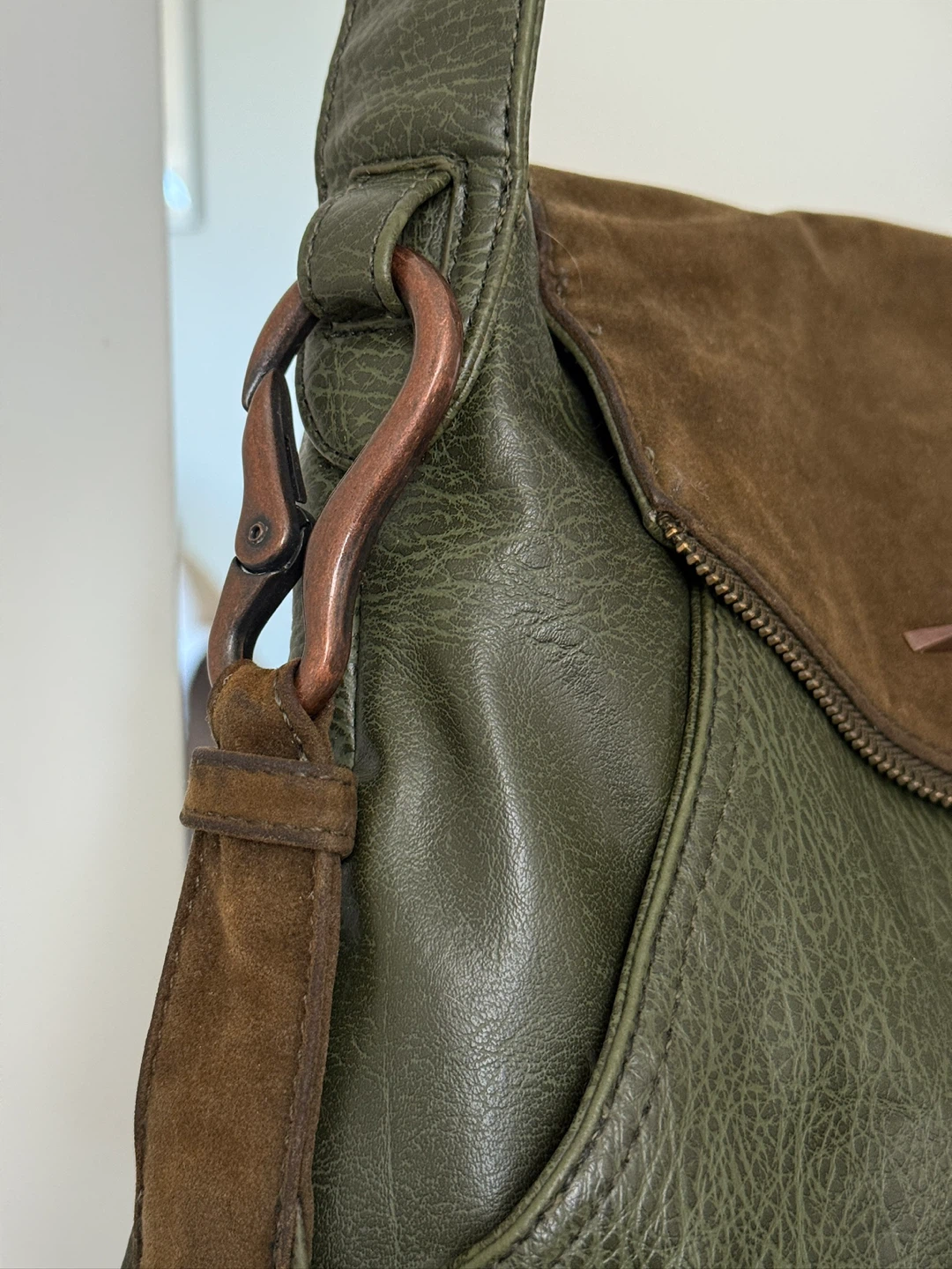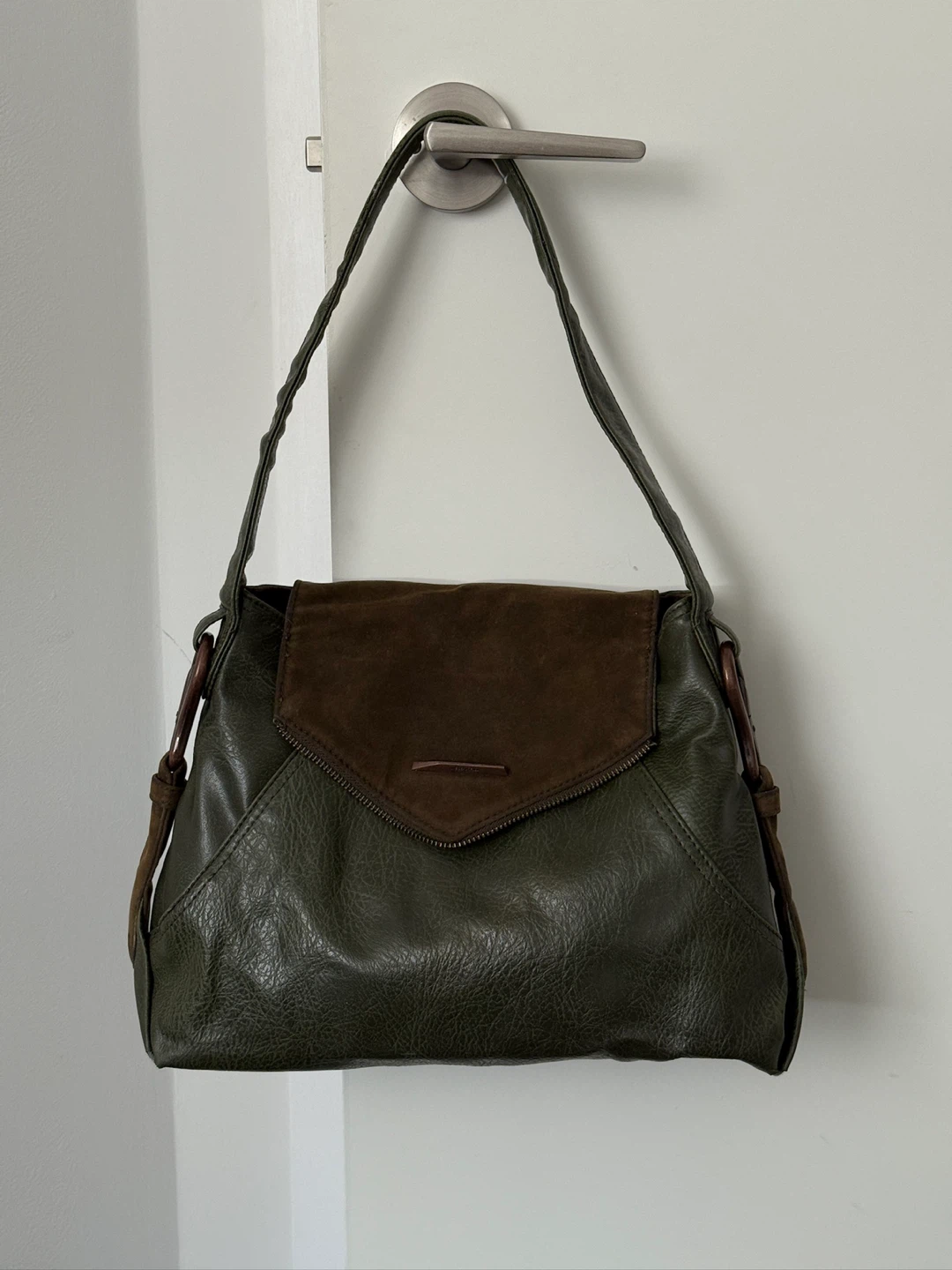 Selling a MATT & NAT shoulder bag in green and brown. It's in great condition and ready for a new home! The bag features a unique design with a suede flap and a zippered closure.