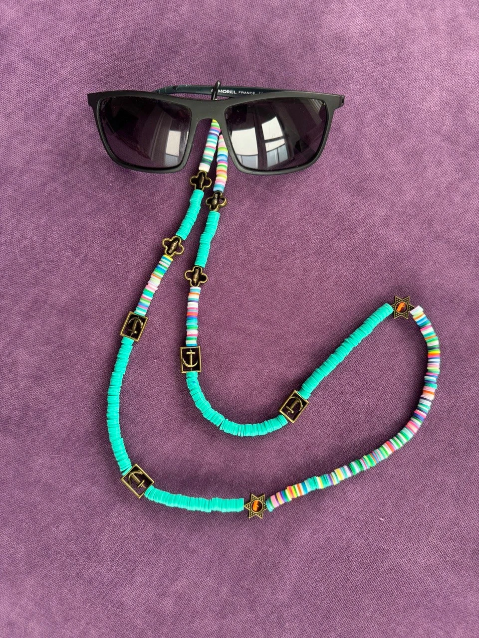 Here's a fun and colourful handmade sunglasses chain! It features turquoise and multi-coloured beads with star and anchor charms. It's perfect for keeping your sunglasses safe and adding a bit of flair to your look
