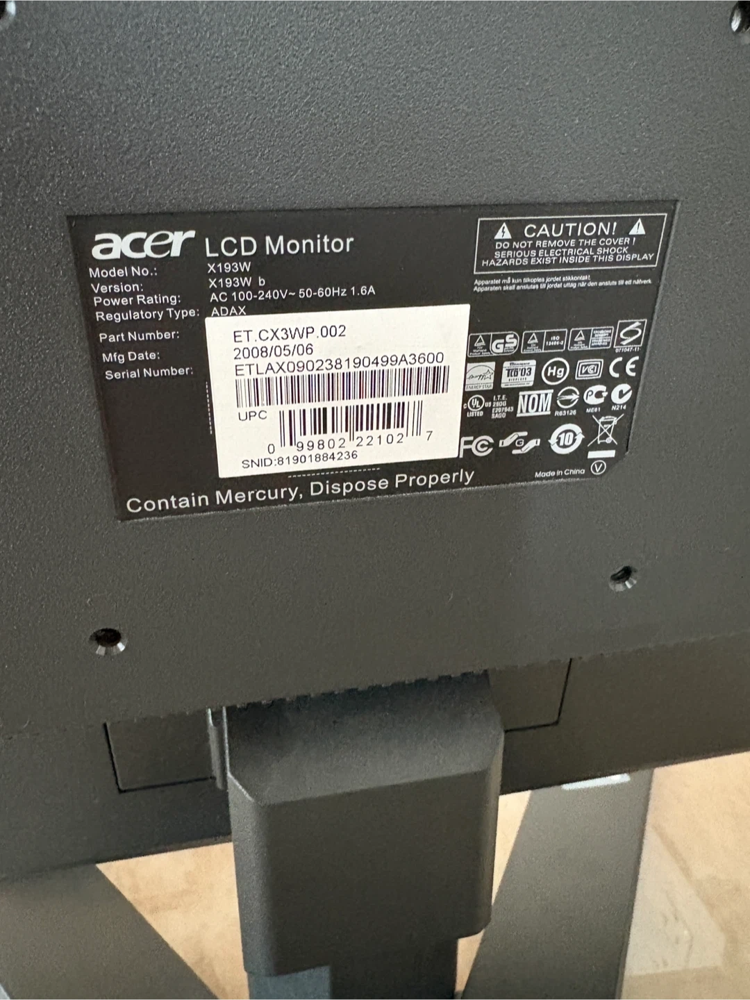 247Acer X193W LCD monitor. It's in excellent condition, Included is the power cable and VGA cable.