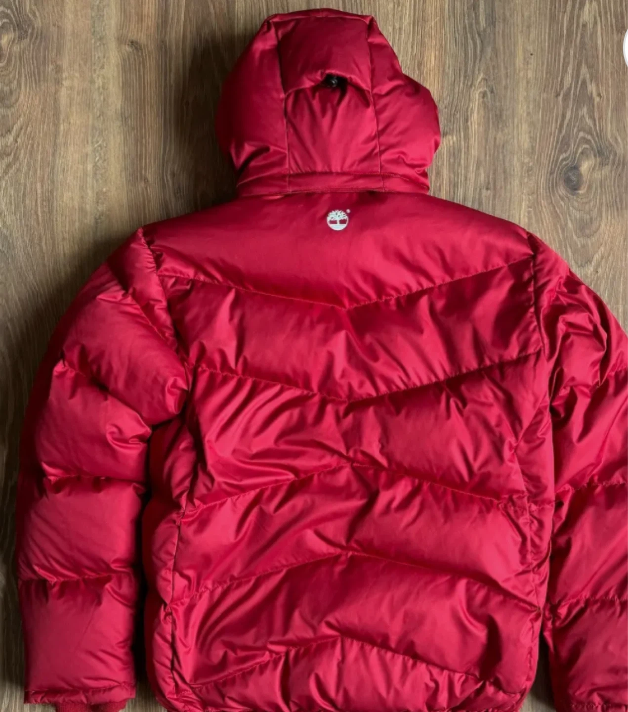 Here's a Timberland puffer jacket in a vibrant red colour! It's perfect for staying warm and stylish during the colder months. The jacket features a hood and a comfortable, padded design. It's in great condition and ready for a new home