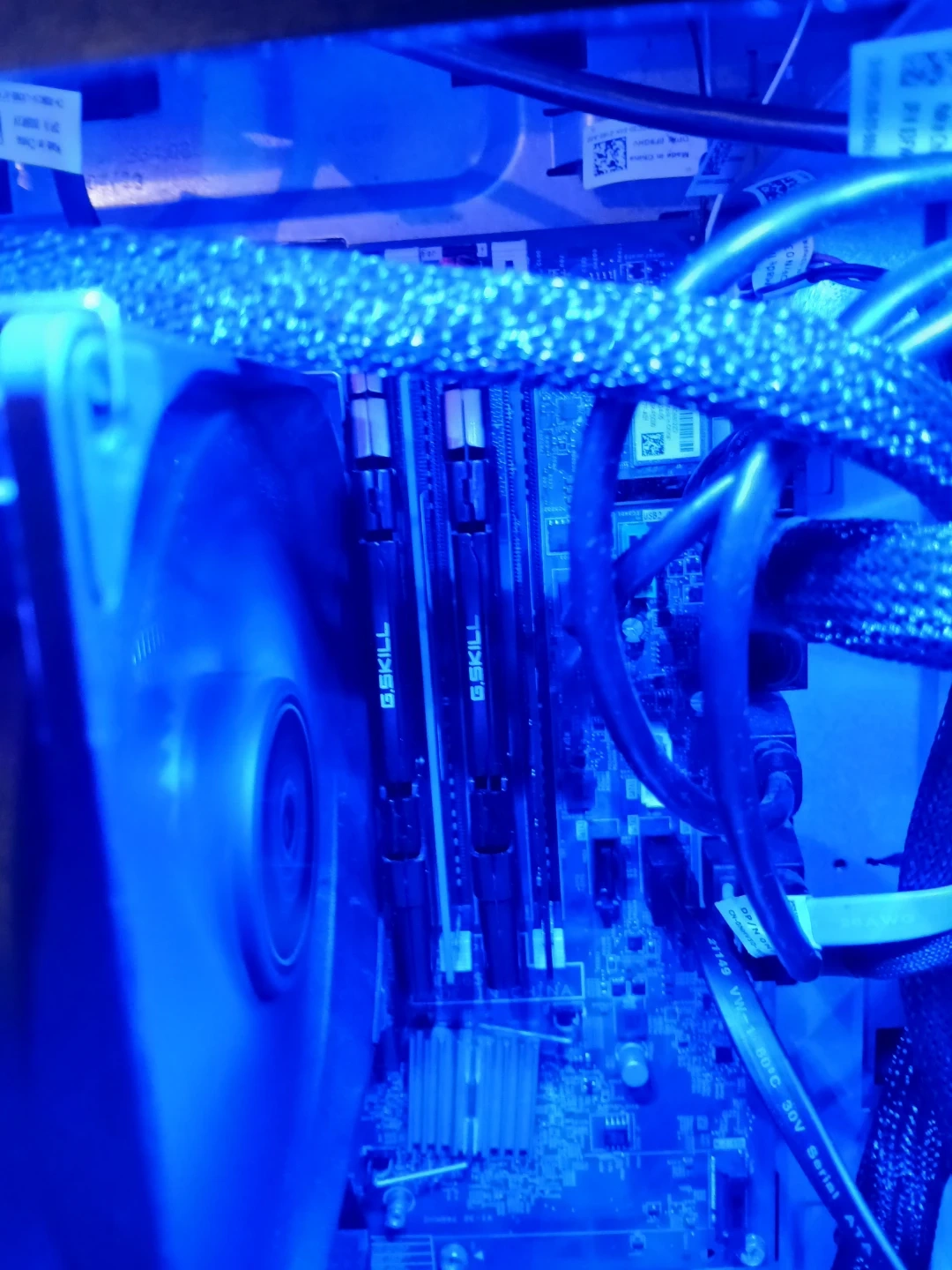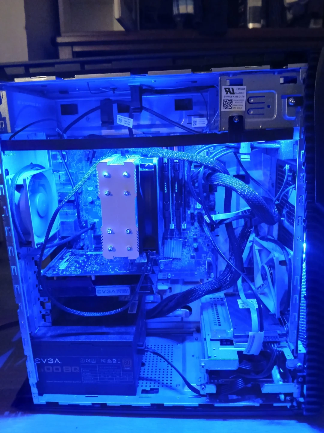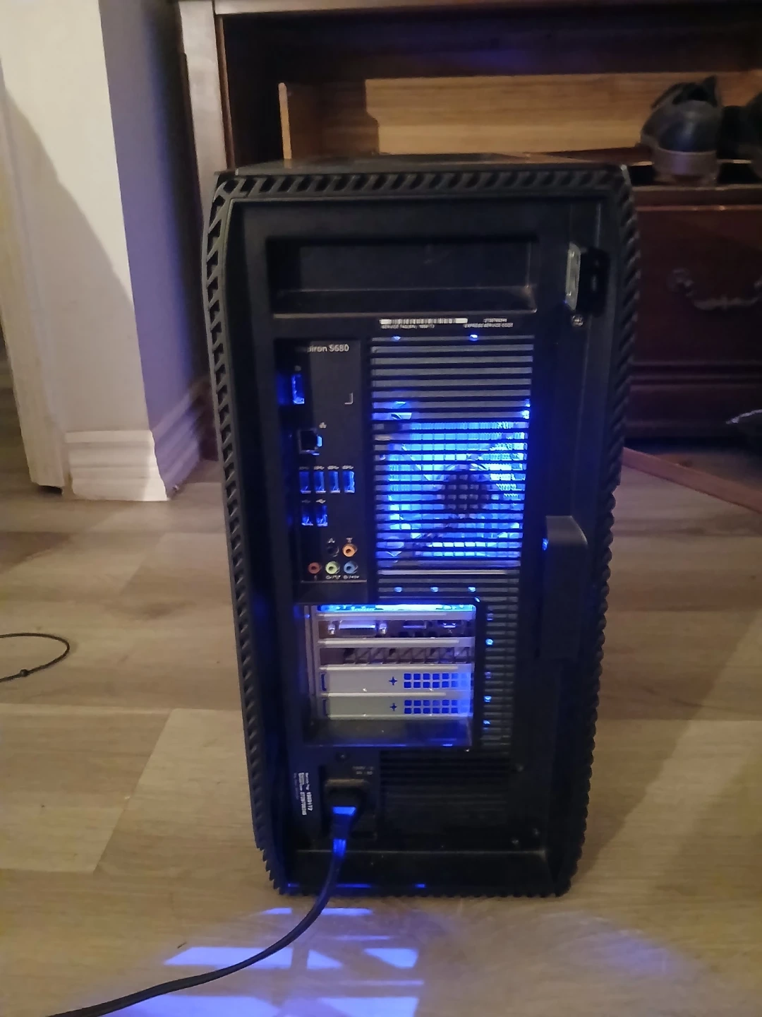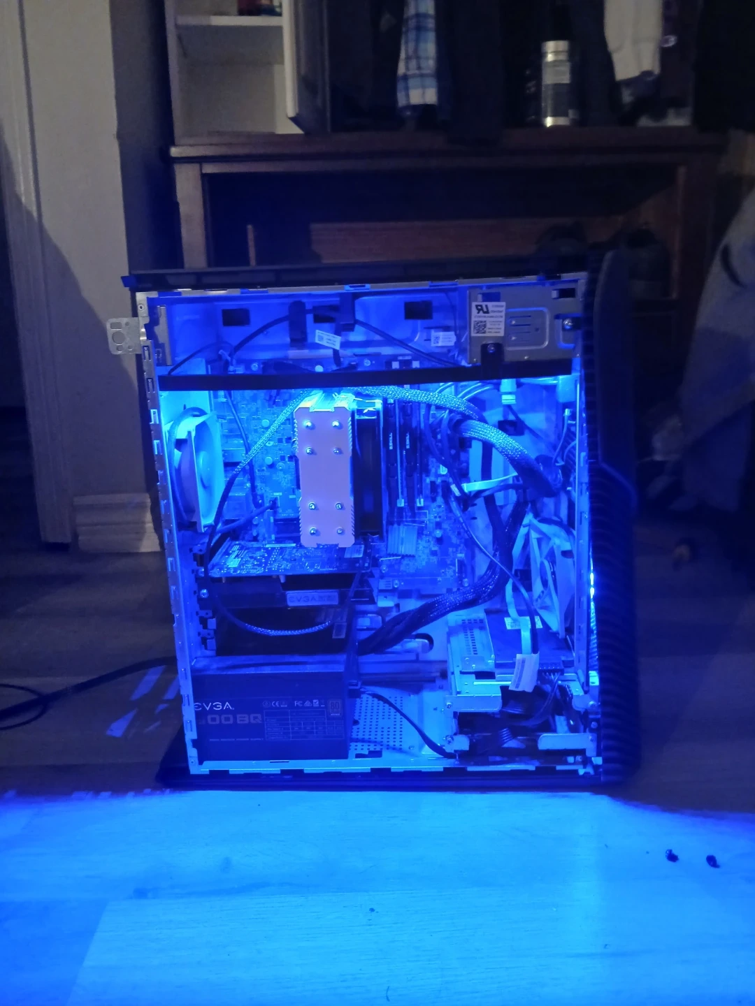 Selling a Dell G5 5680 gaming desktop PC. It features the Dell logo and distinctive blue lighting. It includes an upgraded EVGA 600BQ psu. Comes with a matching EVGA GeForce GTX 1050 Ti gpu(4gb), 32gb GSkill DDR4 RAM, and 500GB Hard-drive. Windows 11 Home is the OS.