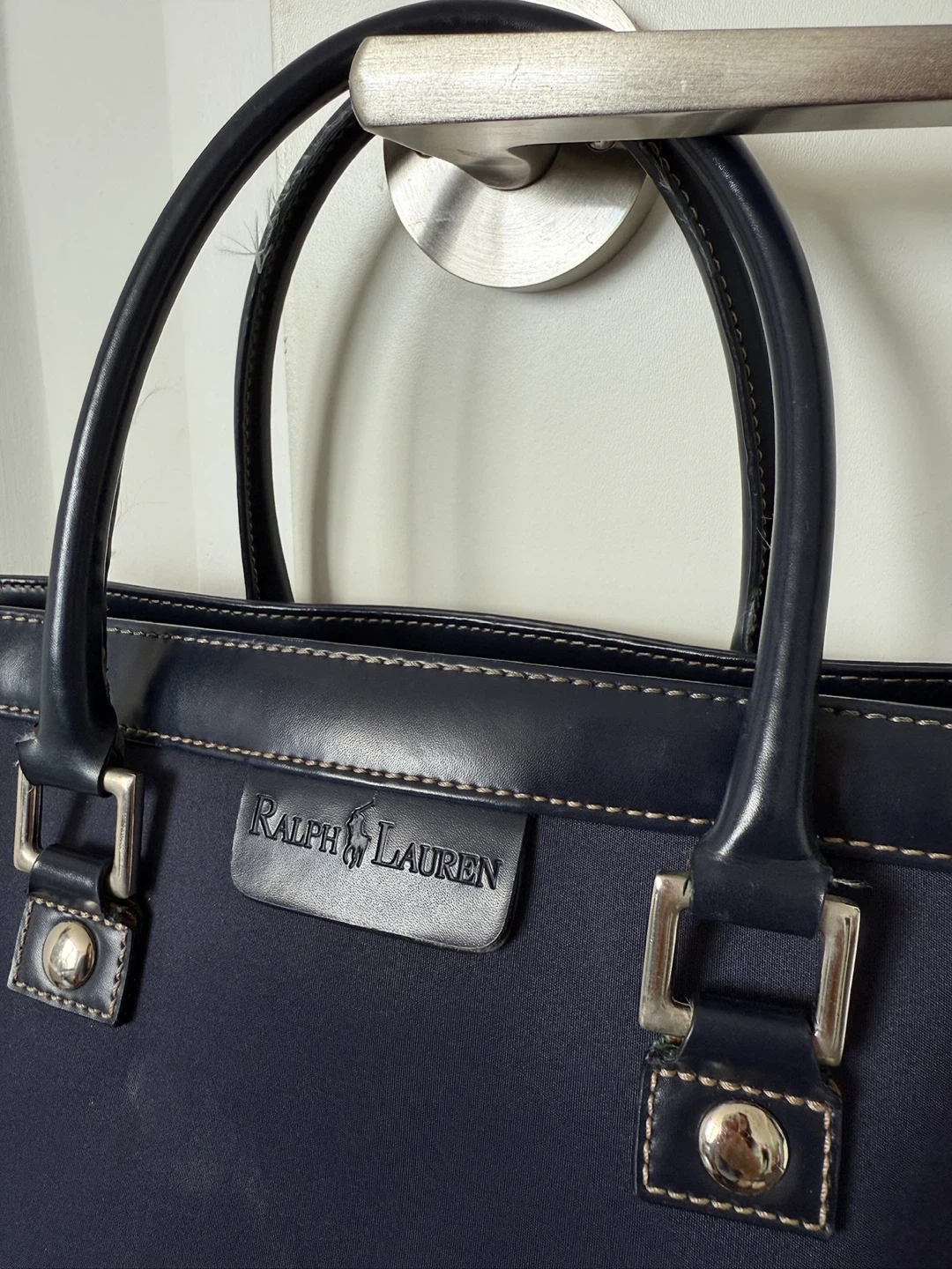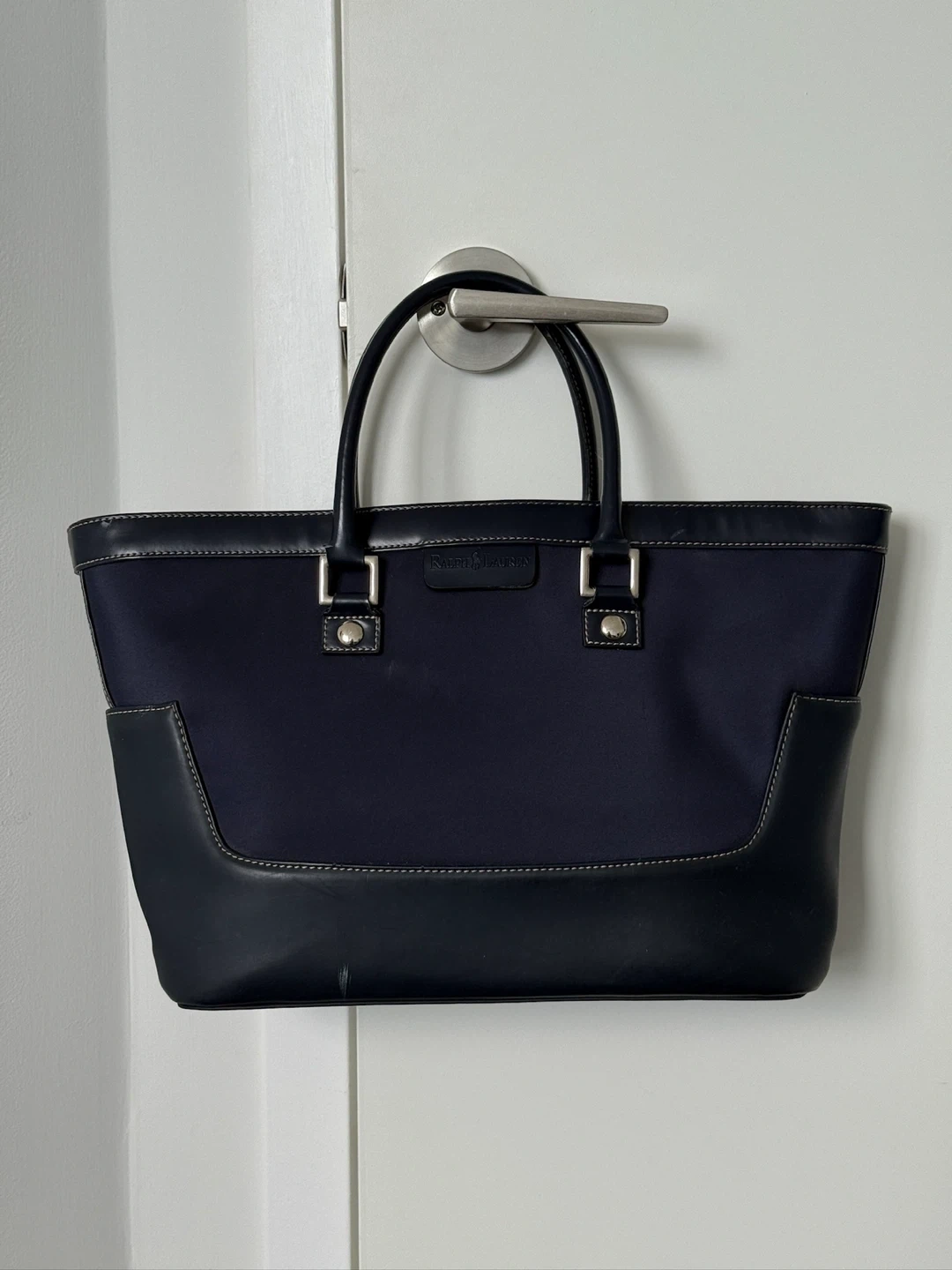 Here's a Ralph Lauren tote bag in navy blue! It's a stylish and practical bag for everyday use. The material is durable and the design is classic. It's in good condition and ready for a new home!
