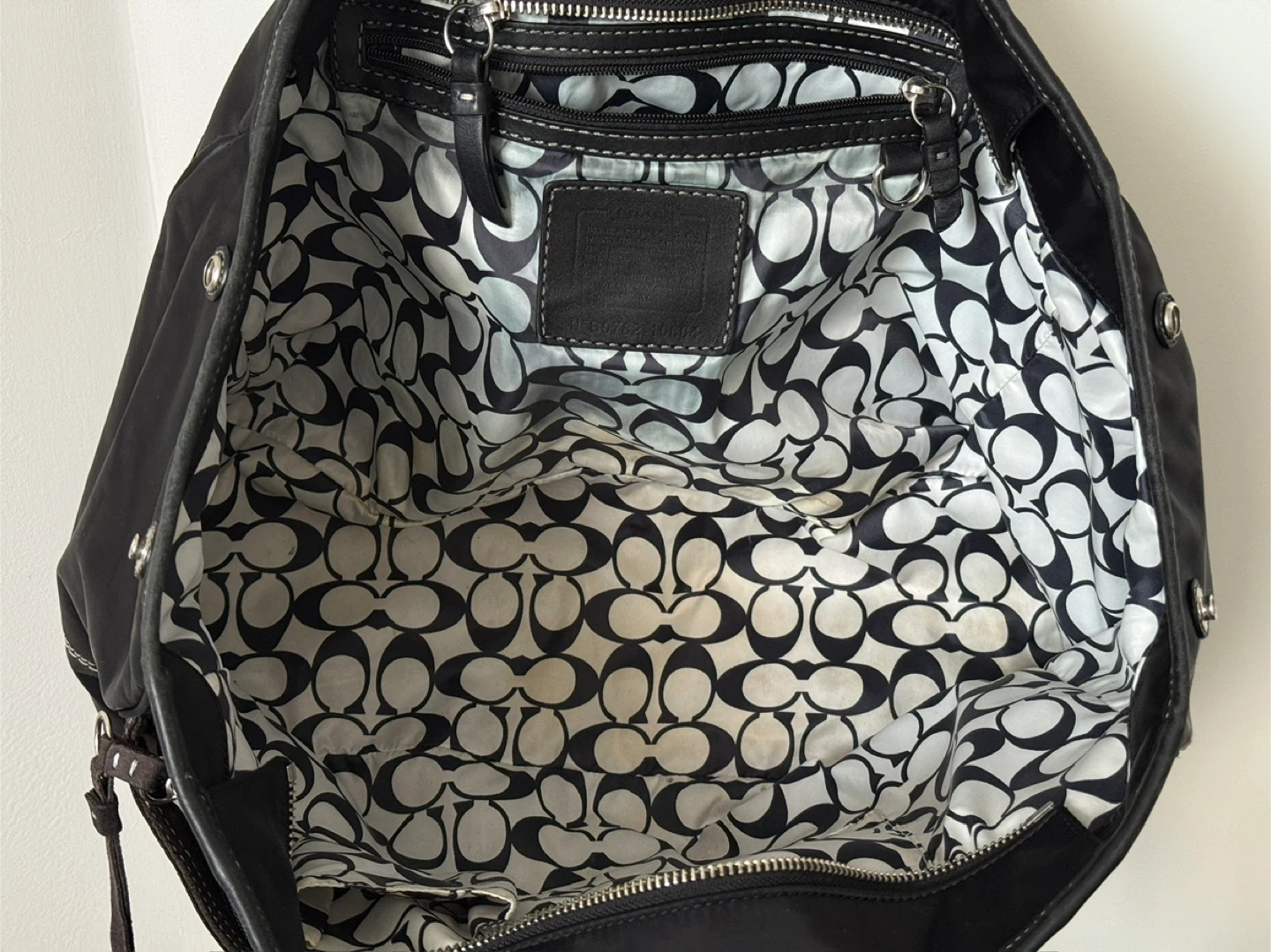 Selling a Coach tote bag in black. It's in good condition and perfect for everyday use. The interior lining features the classic Coach logo pattern. It has some wear and tear, please see photos for details!