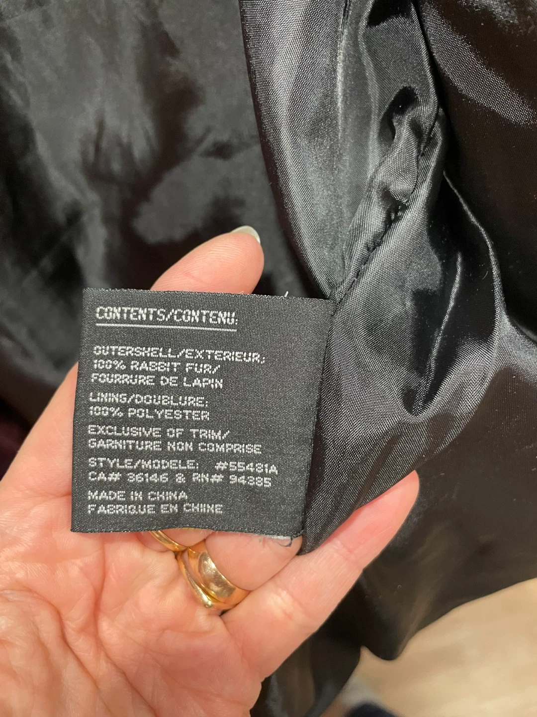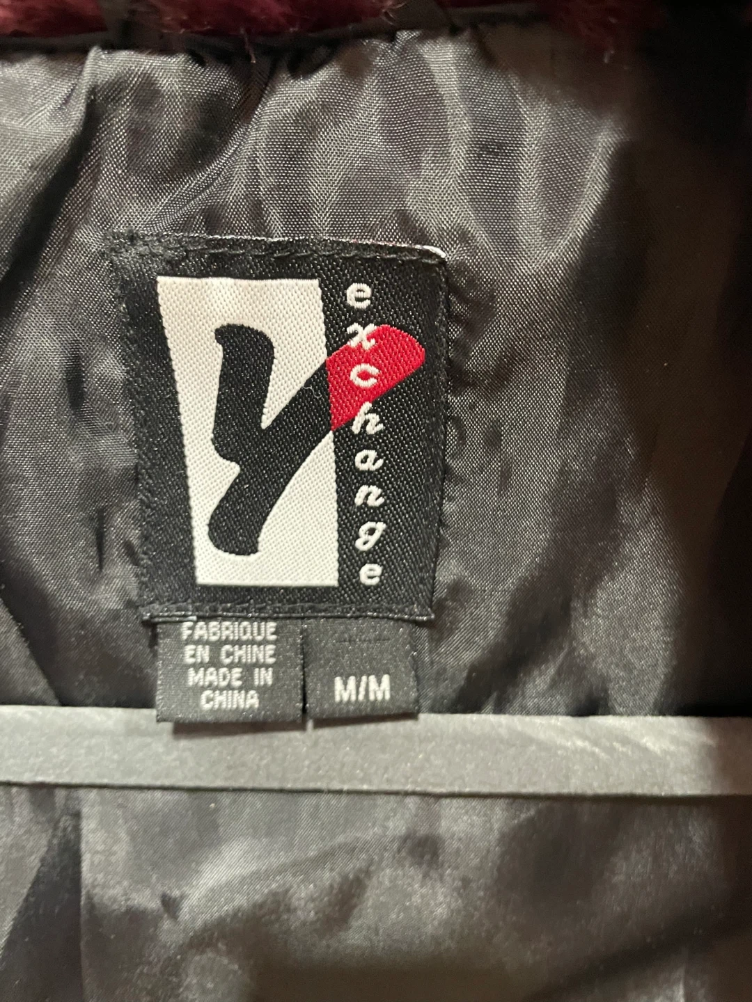 Here's a stylish burgundy jacket from Exchange! It's made with 100% rabbit fur on the outside and lined with 100% polyester. The size is marked as M/M.