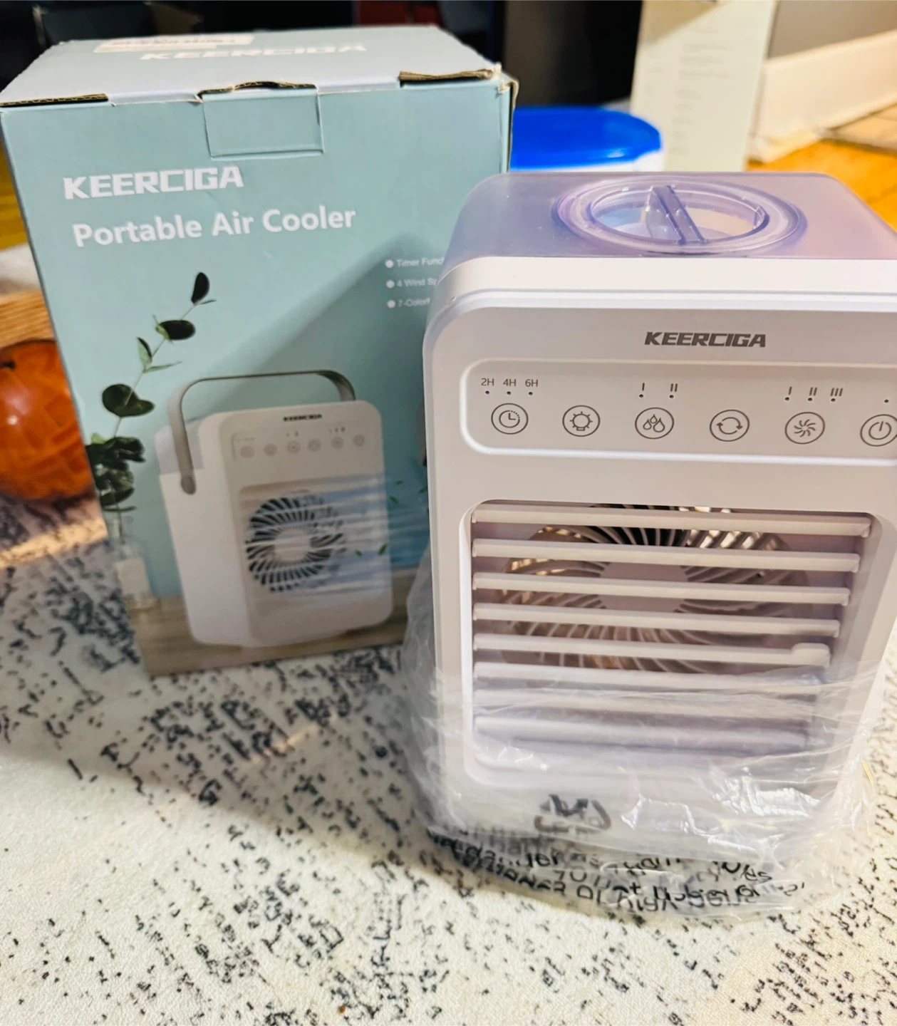 Selling a KEERCIGA portable air cooler in excellent condition! It features a timer function, 4 wind speeds, and 7-colourful lighting. Comes with the original box!