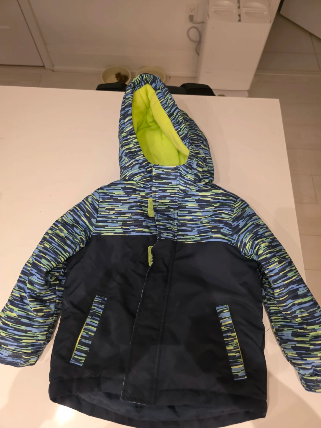 Here's a Joe Fresh toddler winter jacket in size 3. It's a mix of blue and navy with a bright polar yellow-green lining. Perfect for keeping your little one warm this winter!