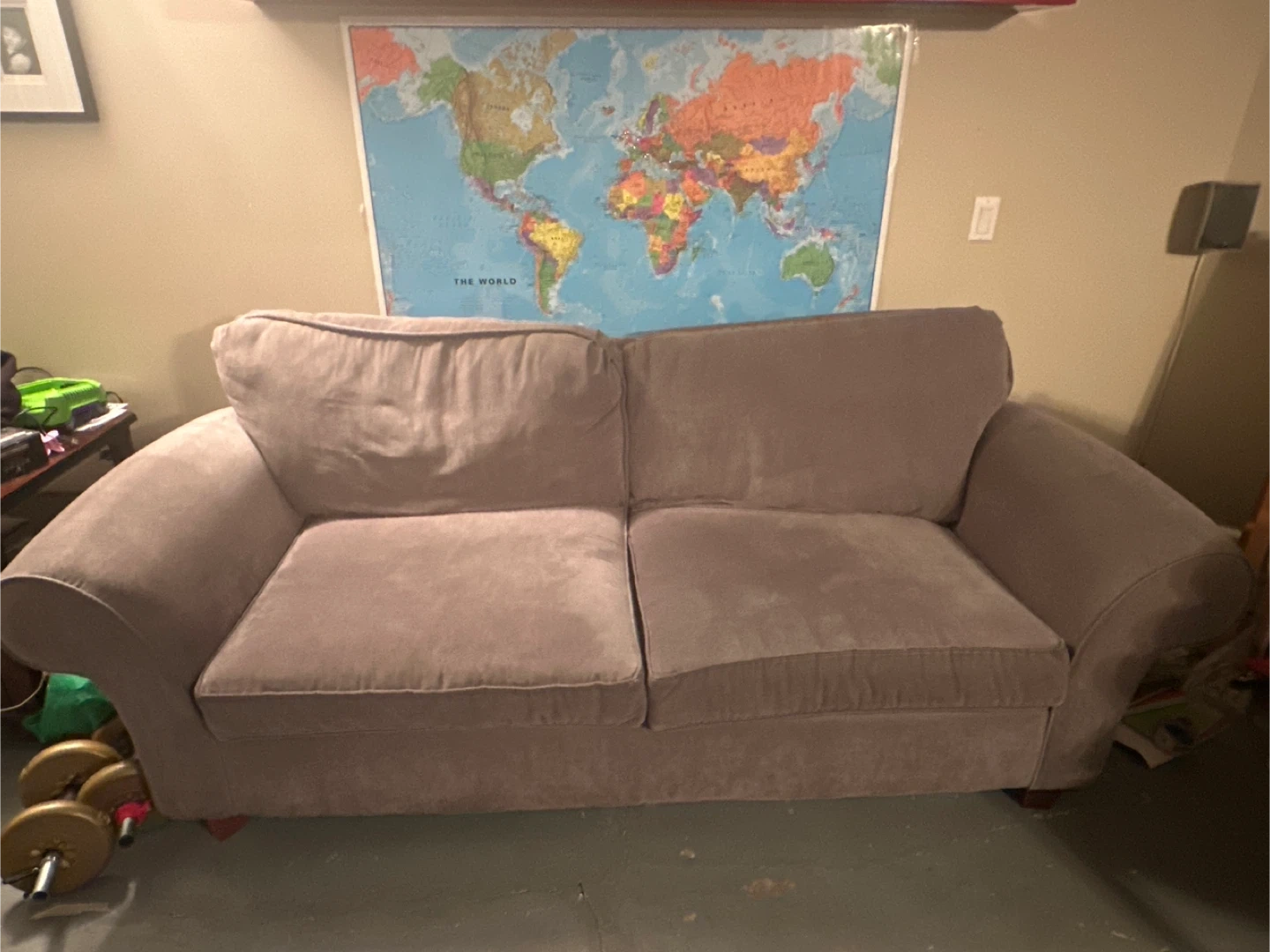Selling a comfy beige sofa! It's in good condition and perfect for a living room or den. It's a great spot to relax and watch movies or hang out with friends
