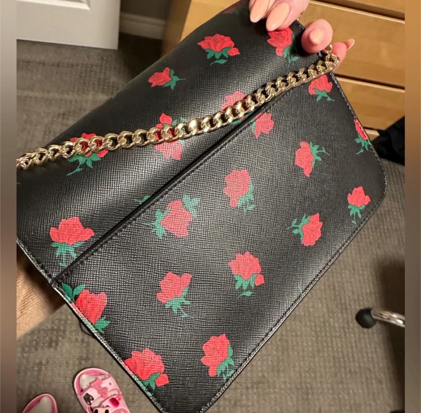 Selling a Kate Spade crossbody bag in black with a red floral pattern! It has a gold chain strap and also comes with a longer, adjustable black strap. Perfect for adding a touch of style to any outfit